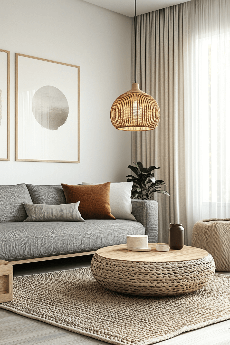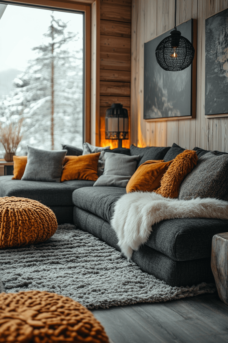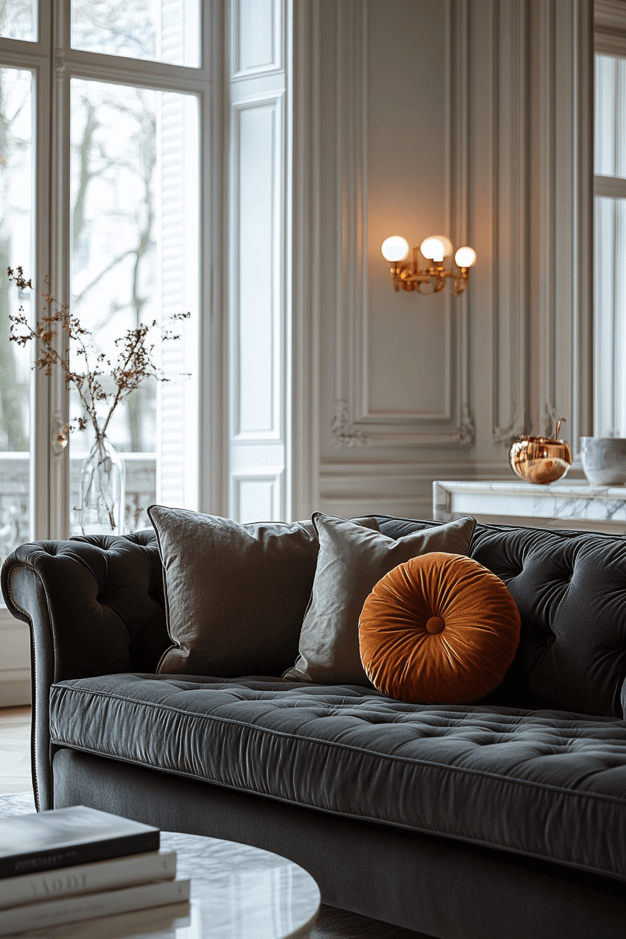 Tactile richness transforms a dark grey couch living room into a layered and inviting environment. Materials like wool, linen, velvet, and leather soften the sofa’s darker tone. Sensory contrast adds warmth and visual interest. The room feels comfortable while remaining stylish. Thoughtful layering enhances depth without clutter.