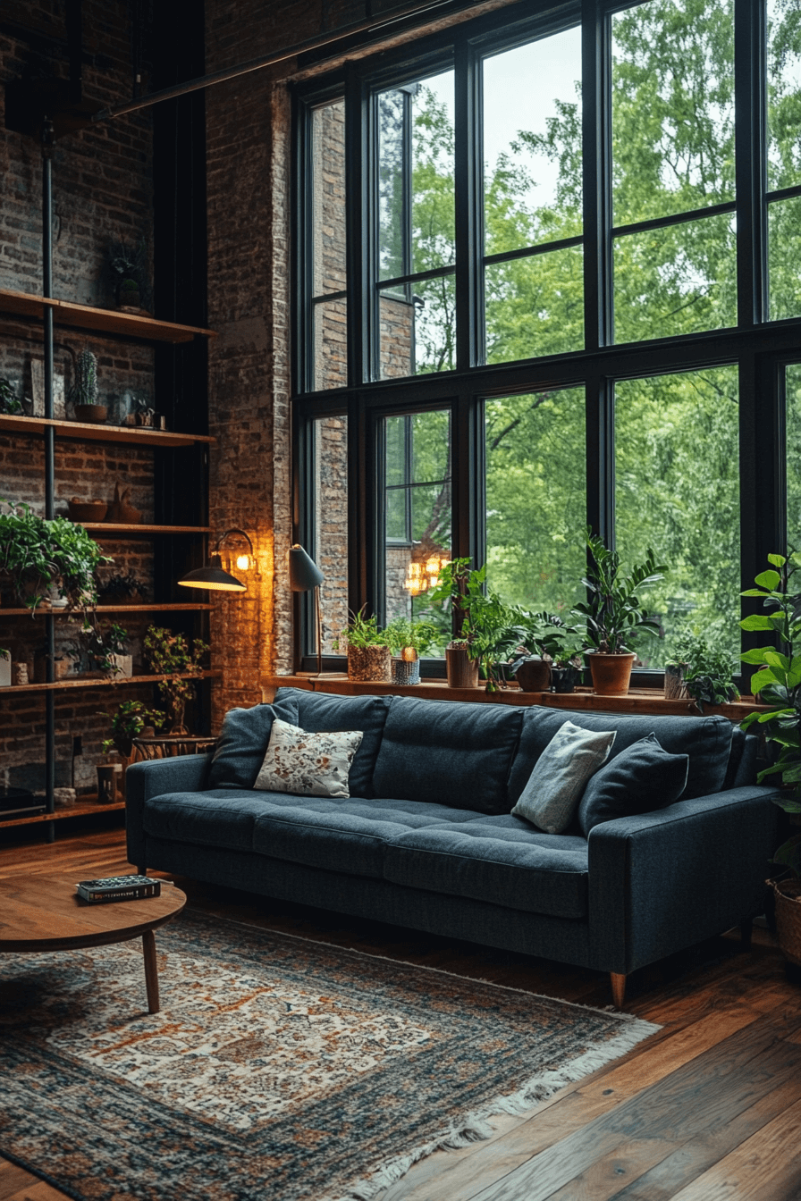 Loft-inspired drama elevates a dark grey couch living room defined by height, light, and openness. Tall windows and bold accents draw attention to the sofa’s cool tone. Minimal furnishings maintain functionality and flow. The space feels expansive rather than crowded. Personality shines through thoughtful restraint.