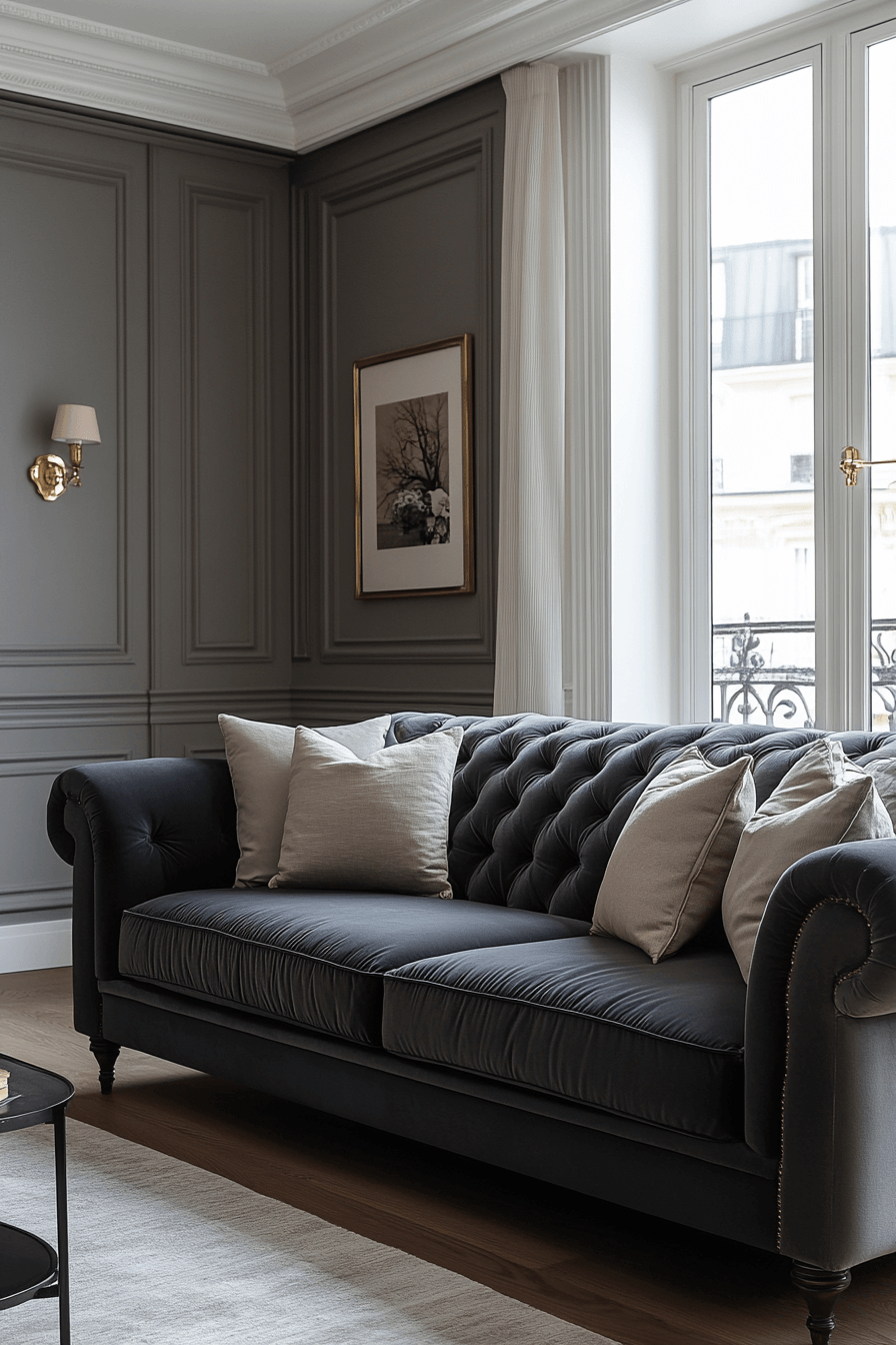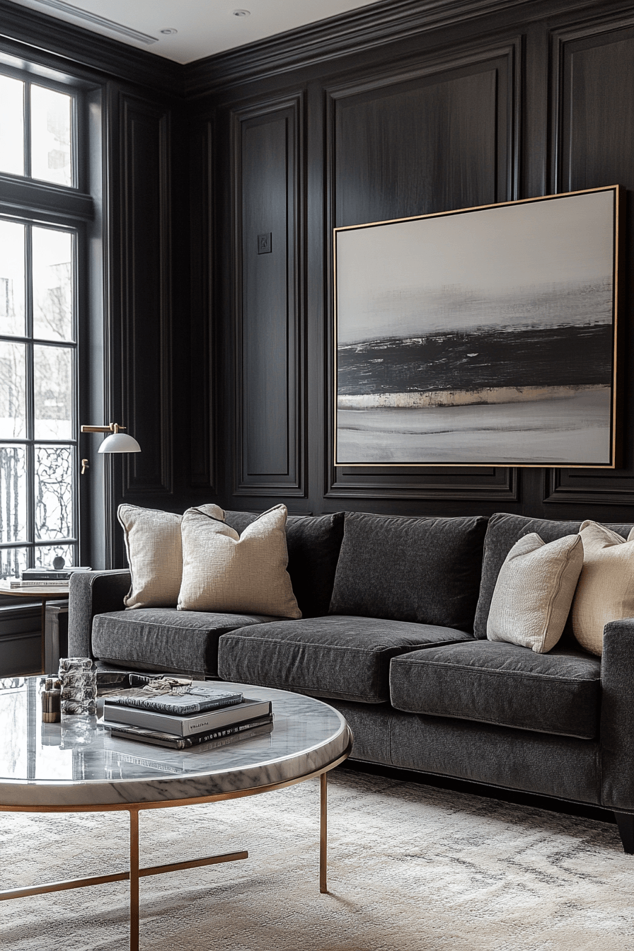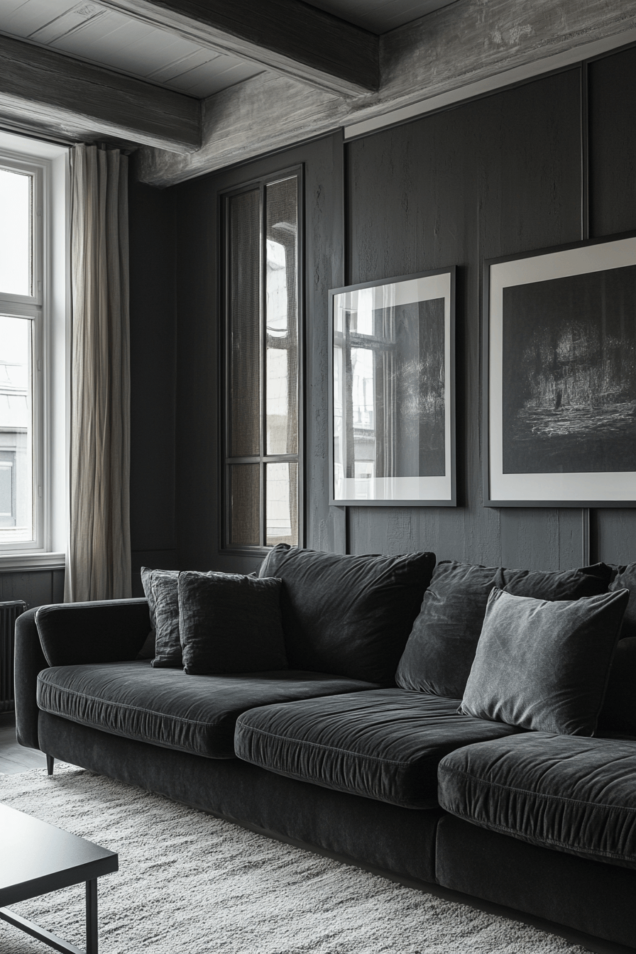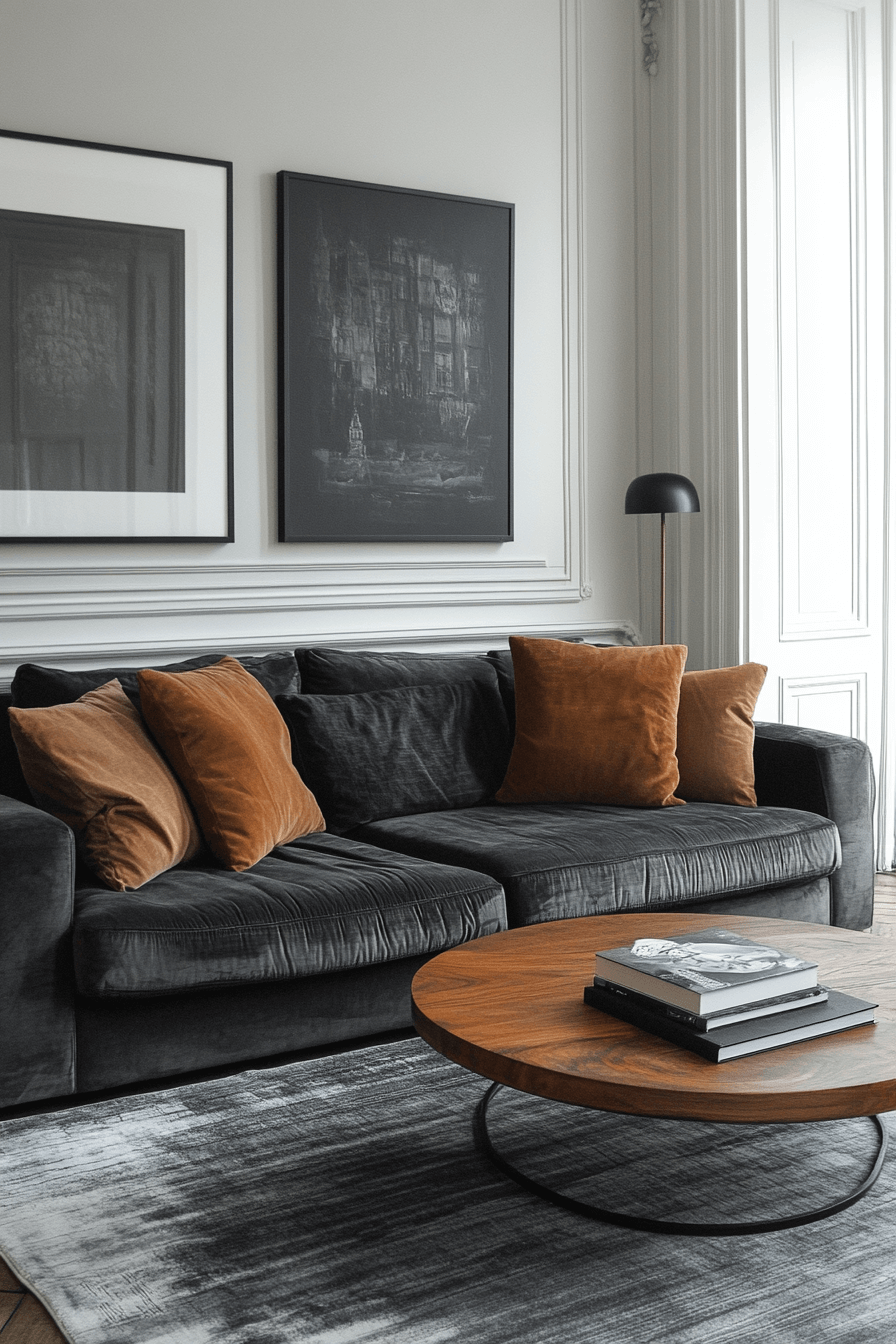 Balanced contrast brings confidence to a dark grey couch living room that blends bold accents with light surroundings. Black-framed art and metallic finishes add structure. Lighter walls soften the overall intensity. The palette feels intentional and composed. Strong choices remain harmonious.