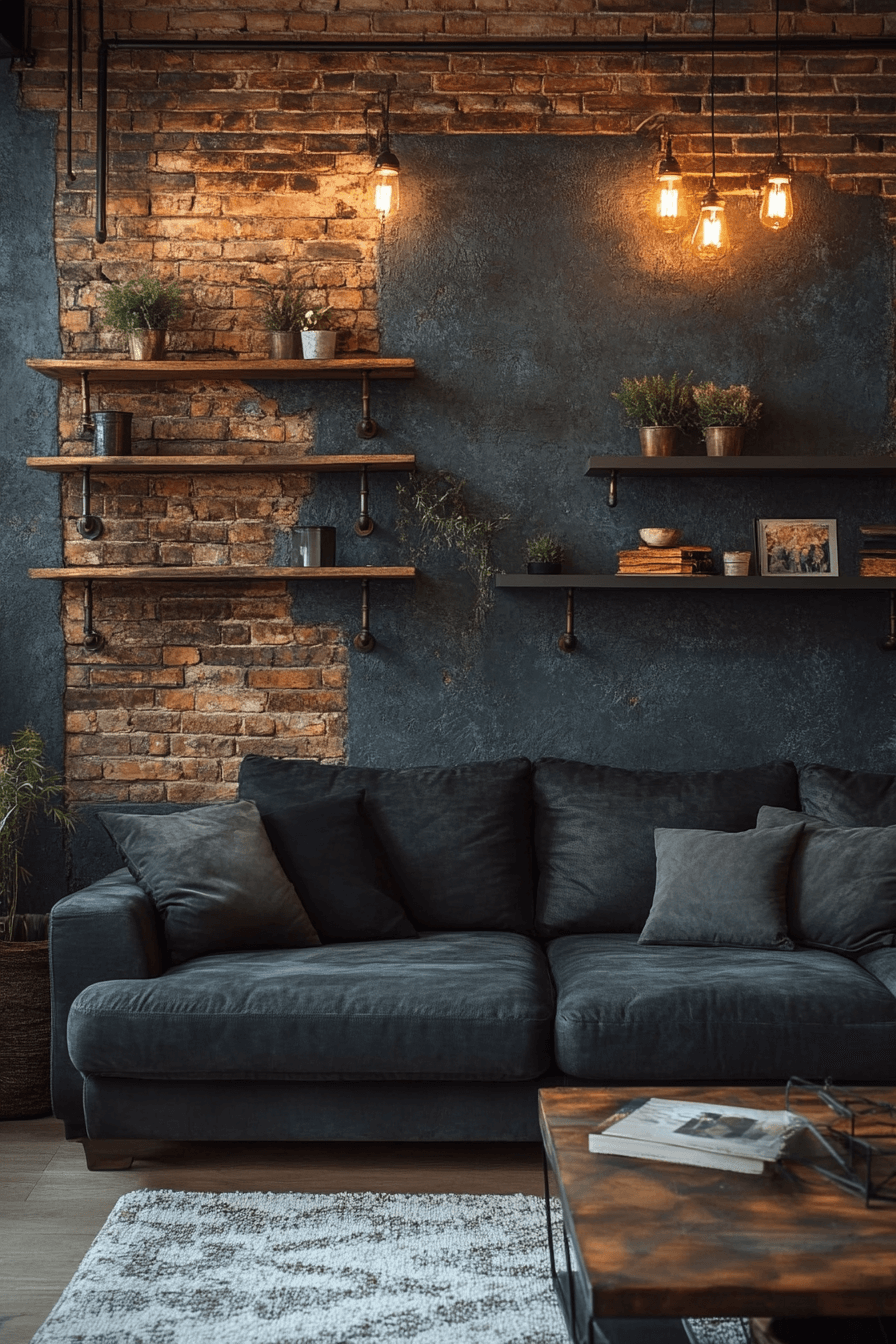 Industrial character defines a dark grey couch living room built around raw materials and strong contrast. Exposed brick, metal shelving, and utilitarian lighting add edge. Wood and leather accents soften the look. The sofa fits effortlessly into the industrial palette. Style remains bold yet approachable.
