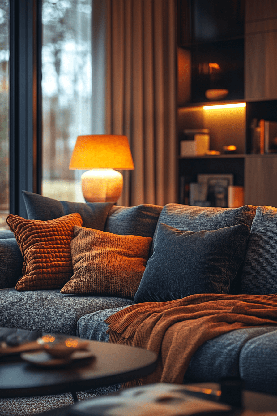 Cozy comfort takes shape through layered textures and warm lighting that soften a dark grey couch living room while maintaining modern style. Plush pillows, knitted throws, and tactile rugs add warmth to the deeper color palette. Subtle wood tones and gentle metallics enhance the inviting mood. The space feels relaxing without losing its contemporary edge. Every element supports comfort and visual harmony.