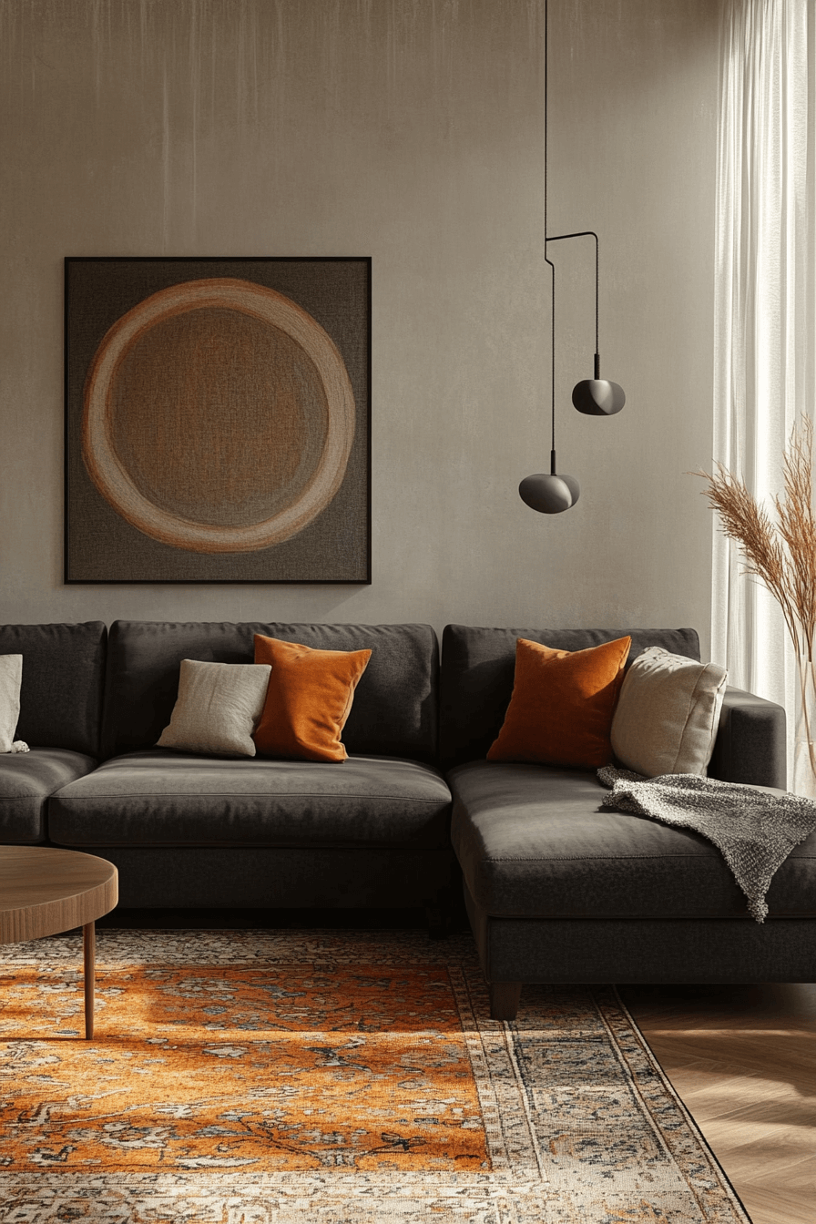 Edgy comfort defines a dark grey couch living room where contrast meets warmth. Bold artwork and defined silhouettes add personality. Plush rugs and layered textiles soften the structure. The space feels expressive yet balanced. Modern style remains approachable.