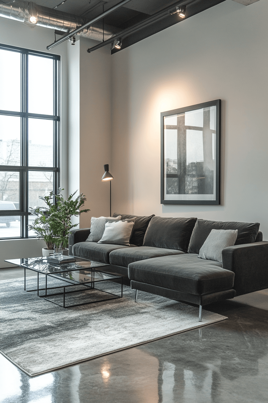 Urban character shines when industrial elements frame a dark grey couch living room inspired by city living. Black metal accents, concrete textures, and oversized artwork introduce structure and personality. Lighter wall colors prevent heaviness while enhancing contrast. Clean layouts keep the look intentional and uncluttered. The result feels modern, grounded, and effortlessly cool.