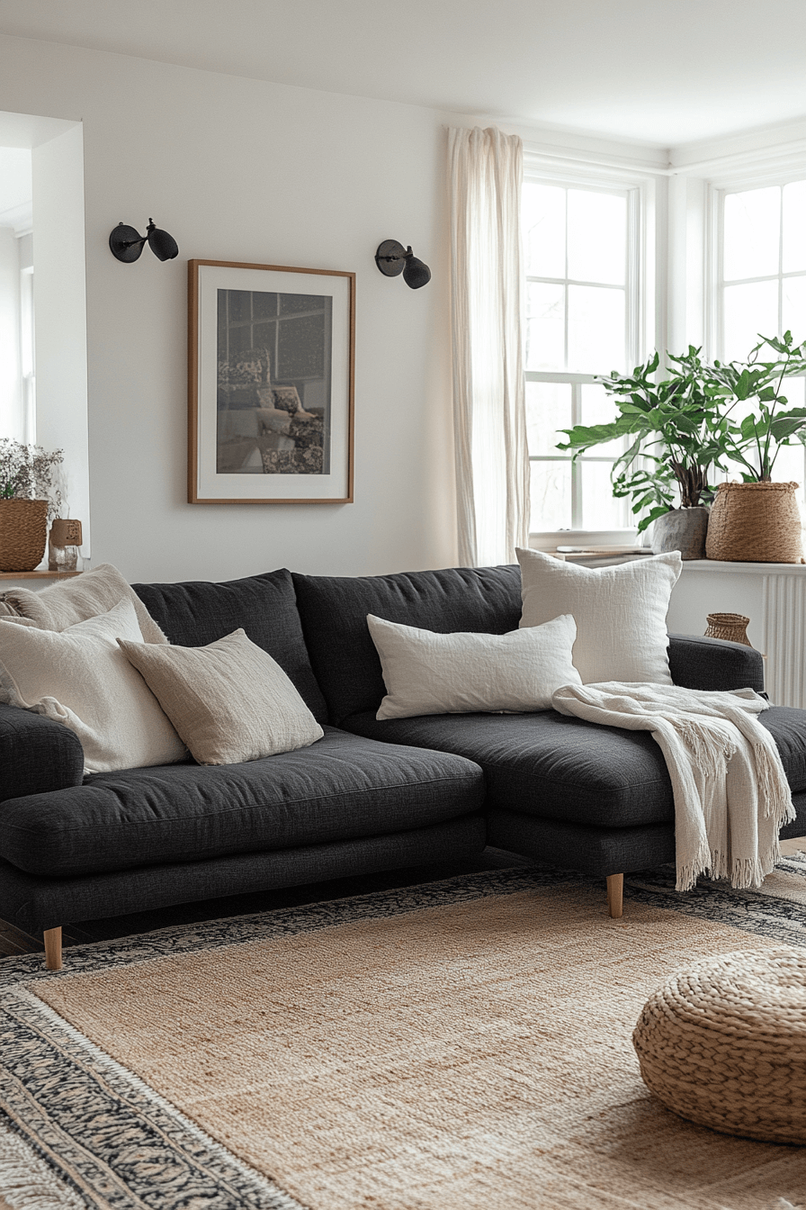 Smart spatial planning enhances a dark grey couch living room in smaller environments. Strategic accents and statement rugs draw attention intentionally. Light surrounding elements keep the layout feeling open. The sofa provides structure without overwhelming the space. Style feels curated and confident.