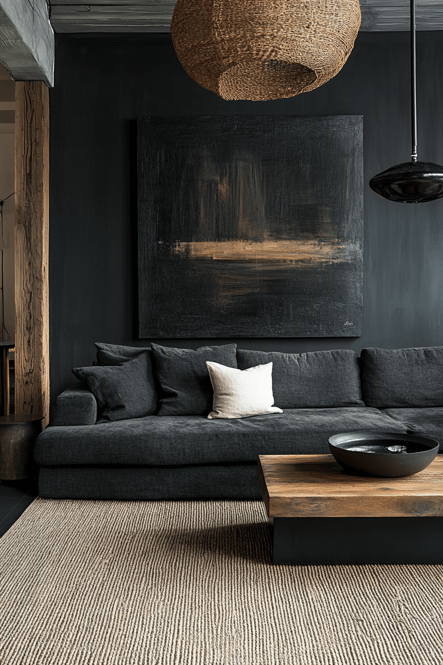 Moody modern design feels elevated when strong contrast and intentional styling shape a dark grey couch living room with visual confidence. Deep charcoal seating anchors bold artwork and sculptural lighting without overpowering the space. Matte finishes and textured rugs add richness while keeping the room grounded. Every design choice contributes to a sense of balance and clarity. Dramatic elements feel refined rather than overwhelming.