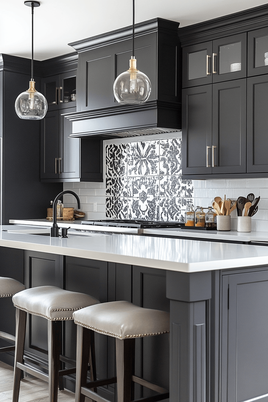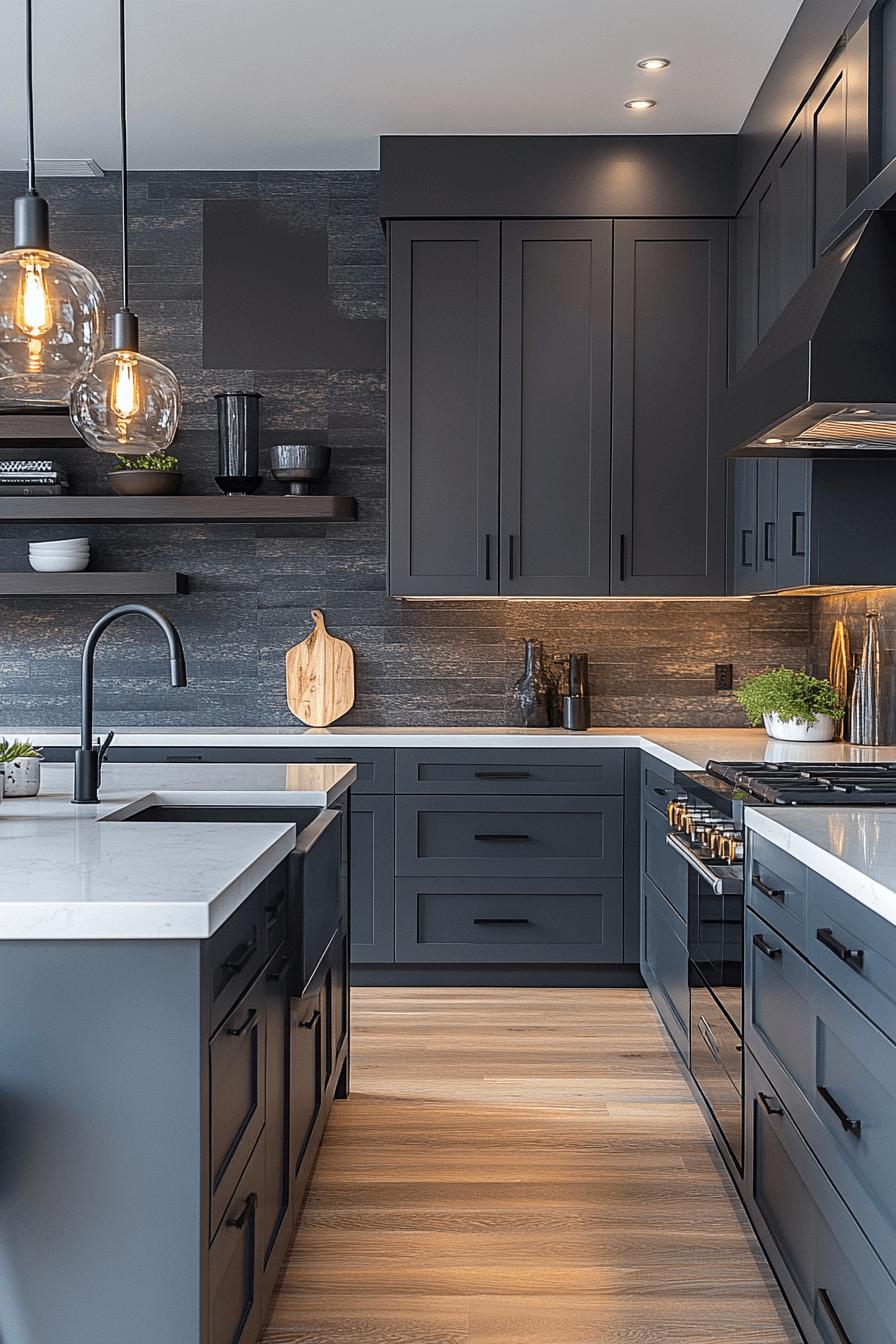Deep charcoal cabinetry creates a strong foundation that instantly elevates the room. In a dark grey kitchen, these cabinets anchor the design while allowing lighter counters and backsplashes to shine. Clean lines and minimal hardware keep everything sleek and intentional. The result feels bold without overpowering the space. This look balances drama with refinement beautifully.