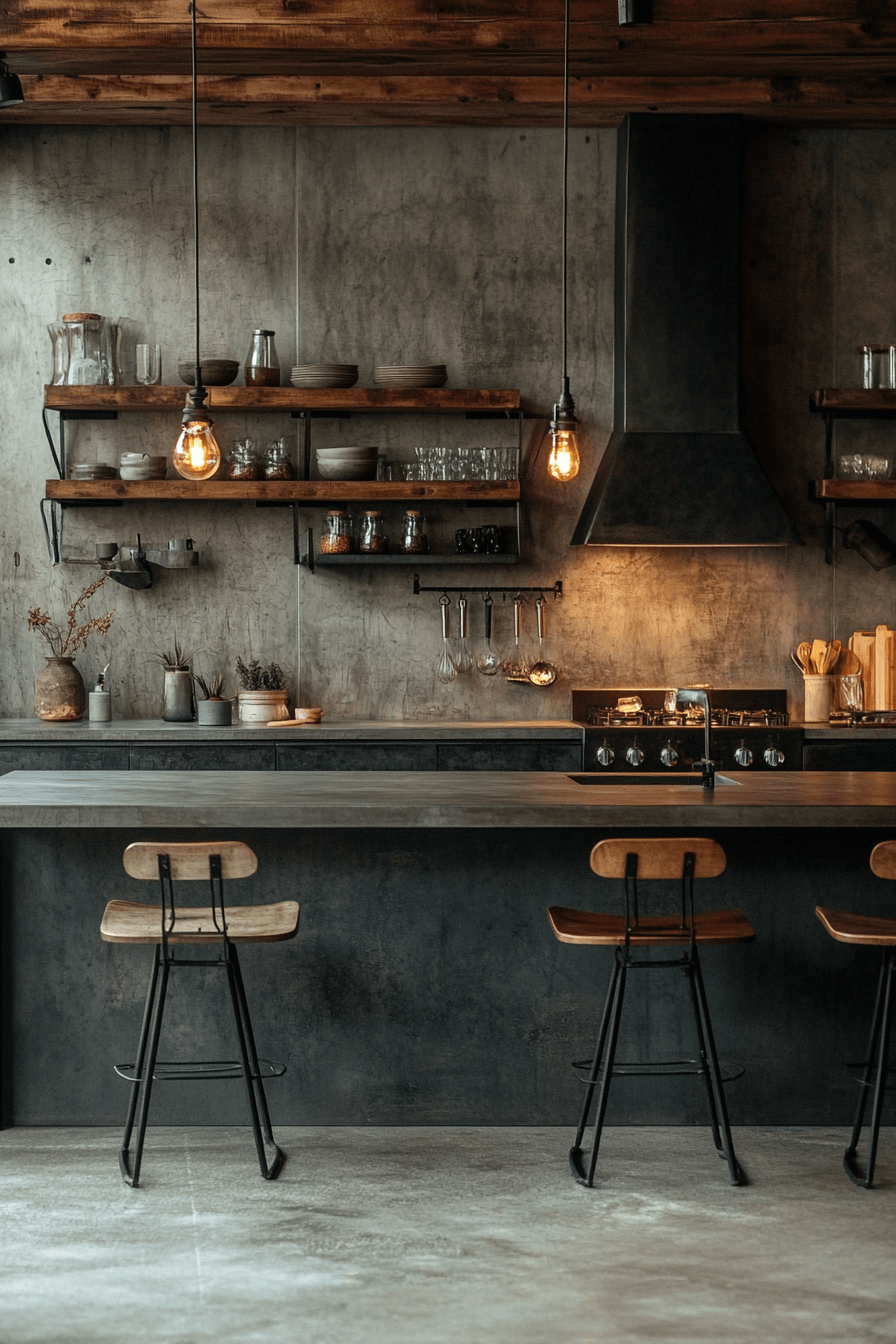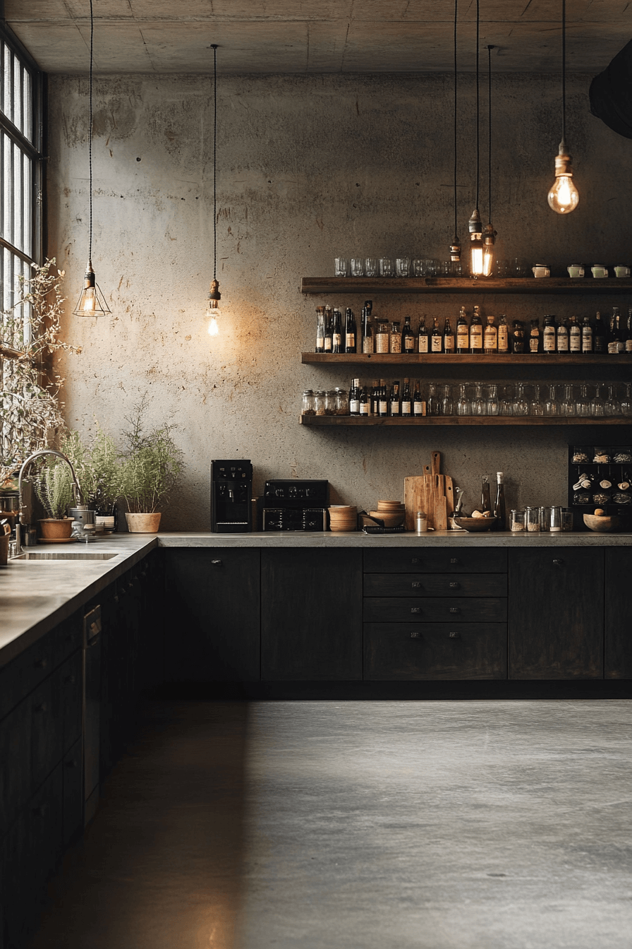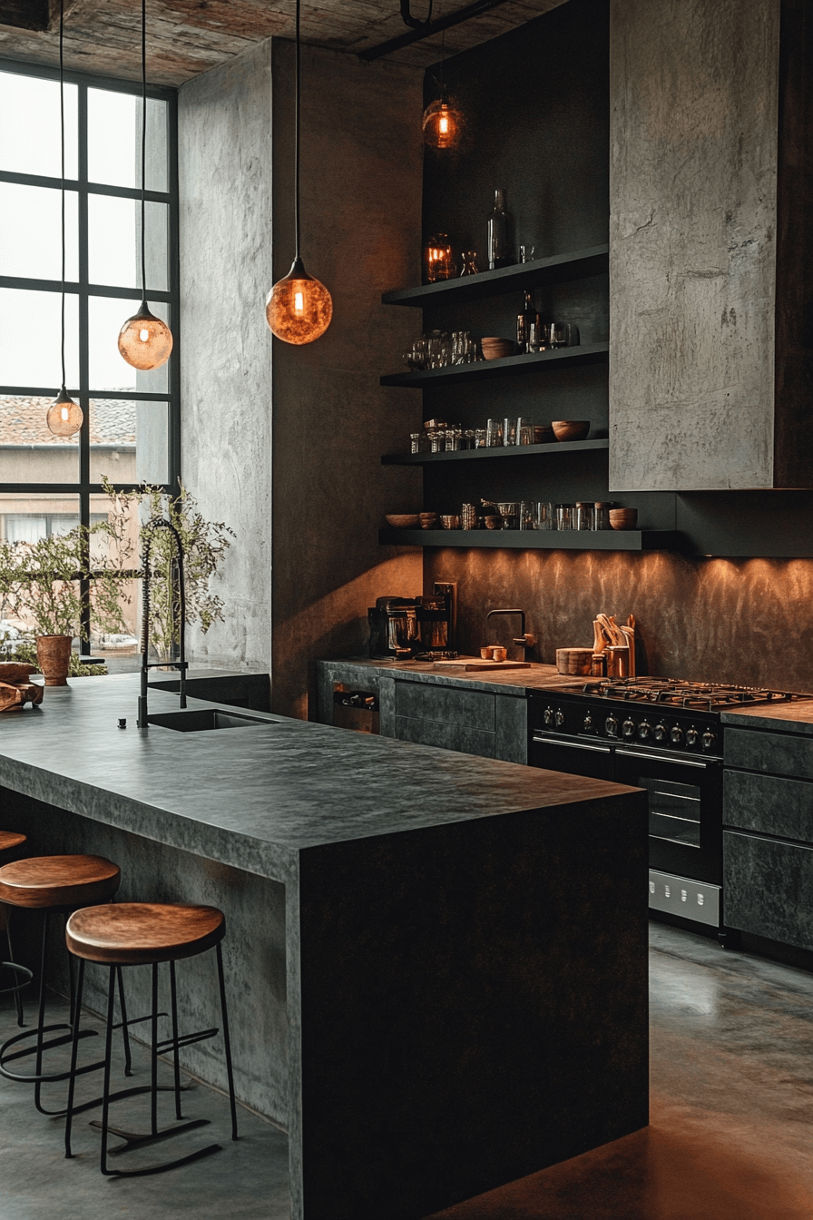 Raw textures and polished finishes blend seamlessly in this edgy layout. A dark grey kitchen paired with concrete and steel elements feels bold yet intentional. Industrial lighting enhances the character of the space. Warm metallic accents prevent the palette from feeling cold. The result is modern and full of personality.