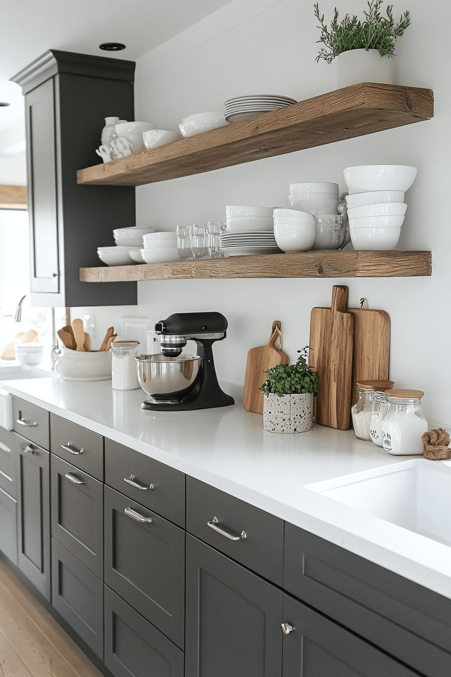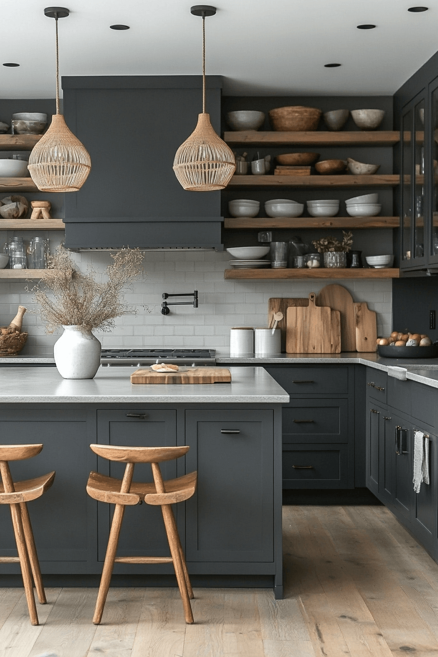 Warm elements transform this moody palette into something inviting. A dark grey kitchen feels cozy when layered with wood surfaces and soft lighting. Open shelving adds charm and personal character. Natural textures balance the deeper tones beautifully. The space feels relaxed yet refined.