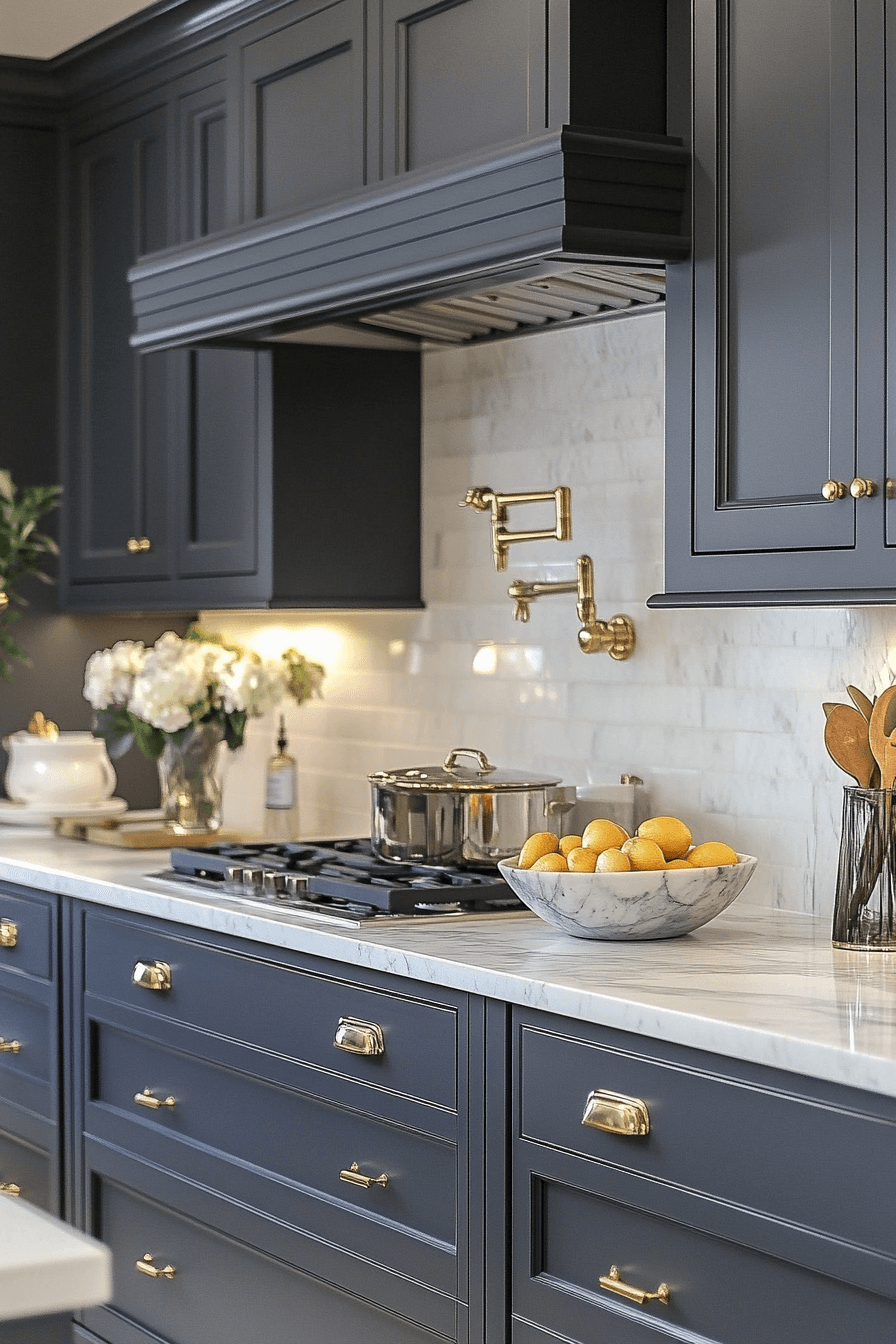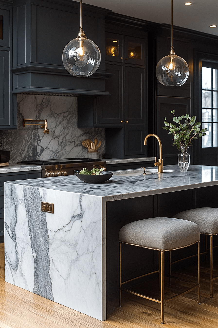 Marble details introduce instant elegance into this refined space. A dark grey kitchen gains visual richness when veined stone adds texture and contrast. Matte or polished fixtures balance the luxurious surfaces beautifully. The natural patterns soften the moody palette. This look feels timeless and elevated.