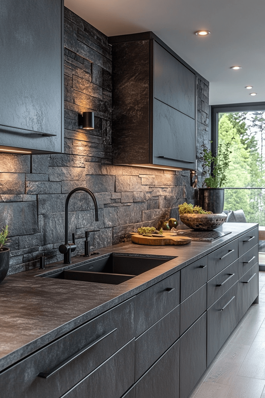 Subtle texture gives this slate-inspired space visual movement. A dark grey kitchen feels richer when tactile finishes contrast smooth countertops. Soft lighting enhances the layered surfaces. Light flooring keeps the palette balanced. The design feels earthy yet refined.