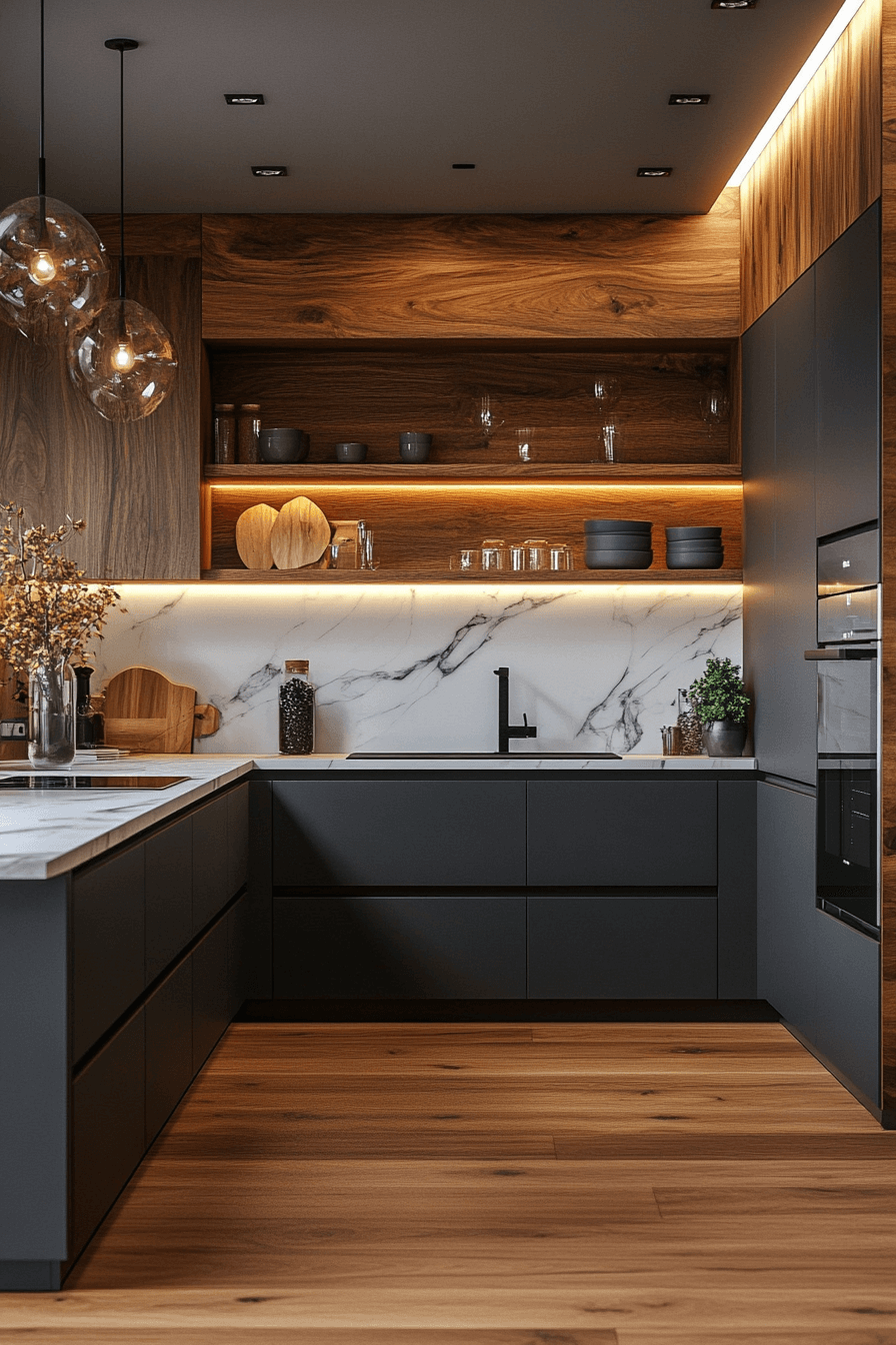 Wood accents bring warmth and balance into this modern layout. A dark grey kitchen paired with ash wood feels both fresh and inviting. Open shelving breaks up the deeper tones beautifully. Light counters keep the design bright. The blend feels effortless and cozy.