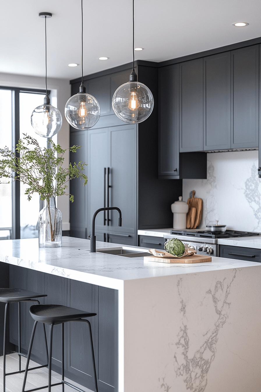 Bold design choices give this kitchen undeniable presence. A dark grey kitchen comes alive with high-contrast elements and statement lighting. Oversized pendants and striking surfaces reinforce the dramatic effect. Light flooring keeps the space visually open. The look feels confident and expressive.