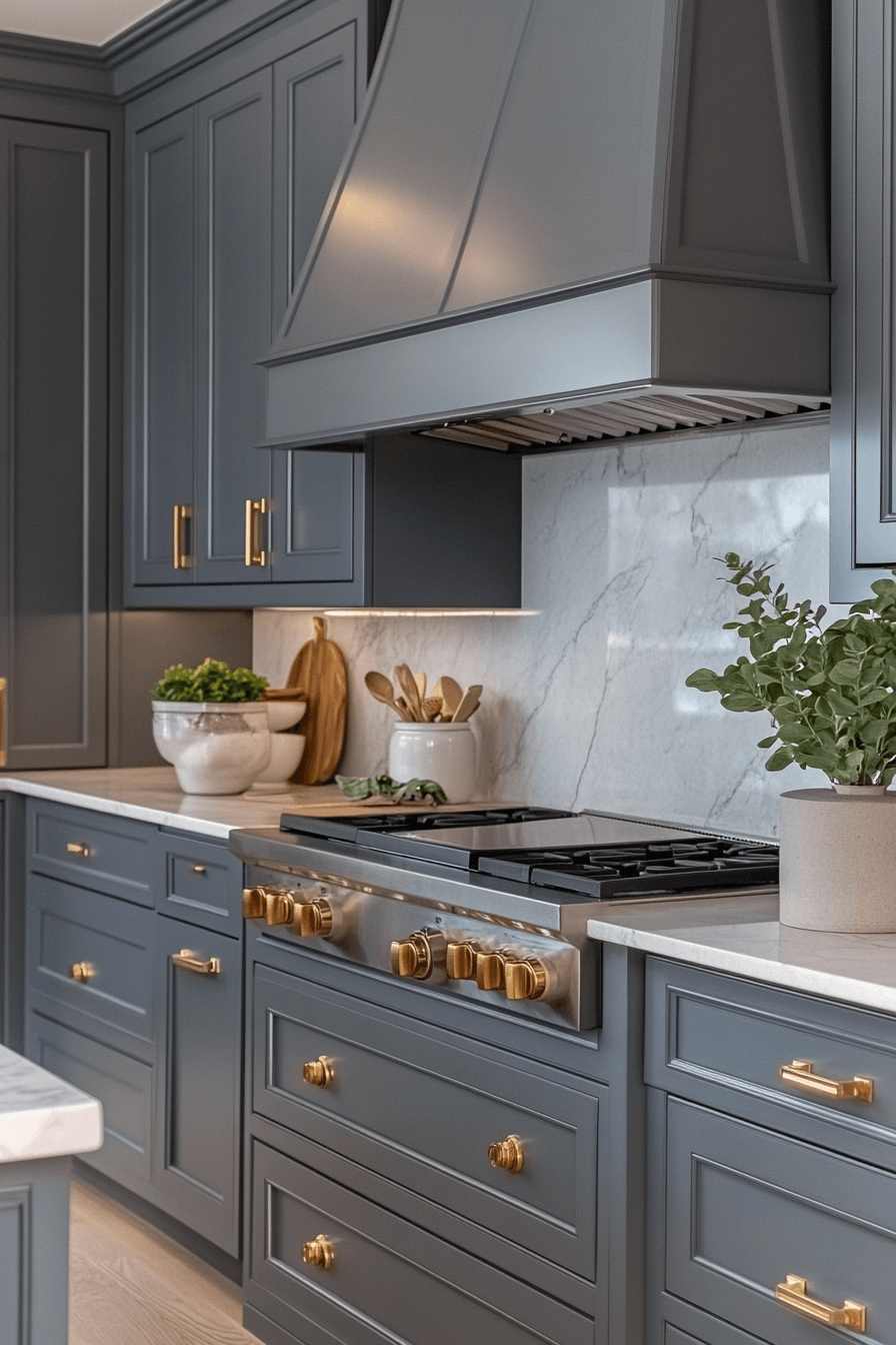 This elevated design focuses on premium materials and thoughtful layering. A dark grey kitchen feels luxurious when rich cabinetry pairs with warm metallic hardware. Quartz counters and statement lighting enhance the upscale atmosphere. Every detail feels intentional and refined. The space balances beauty with function.