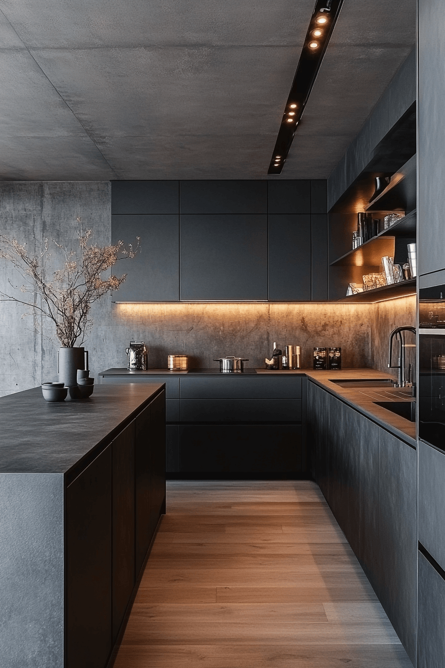 Raw textures and polished finishes blend seamlessly in this edgy layout. A dark grey kitchen paired with concrete and steel elements feels bold yet intentional. Industrial lighting enhances the character of the space. Warm metallic accents prevent the palette from feeling cold. The result is modern and full of personality.