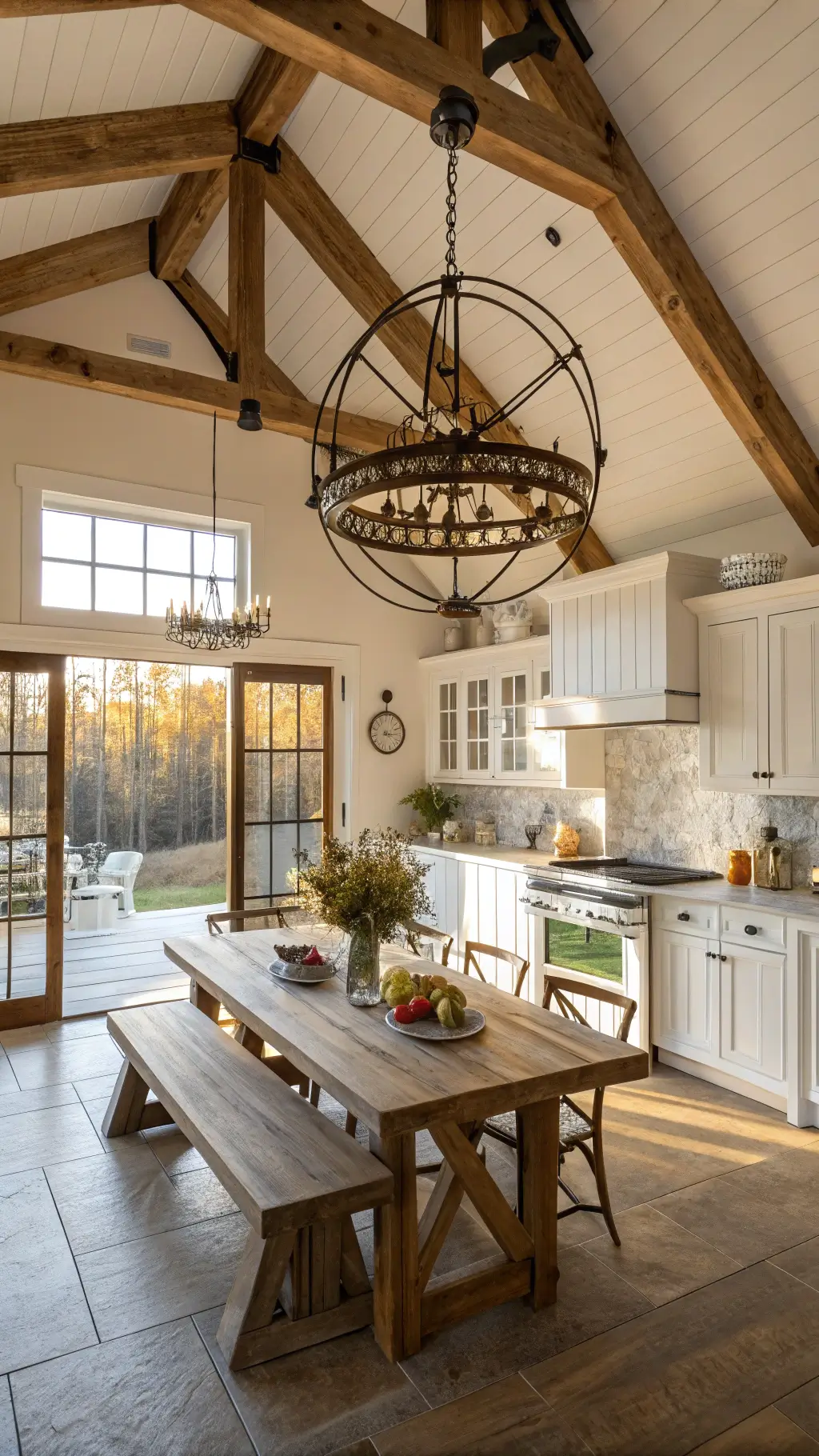 A bright, spacious morning kitchen with a high cathedral ceiling, rustic wooden crossbeams, oversized clear glass pendant lights over a whitewashed oak island, brushed nickel hardware, and milk glass cabinet fronts, styled with white ceramic canisters, potted herbs, and vintage bread boards, with a window wall allowing sunlight in.
