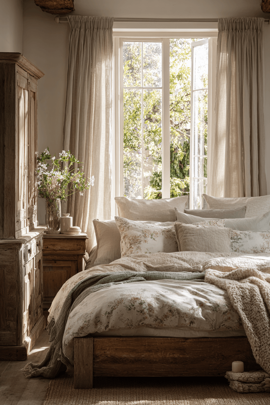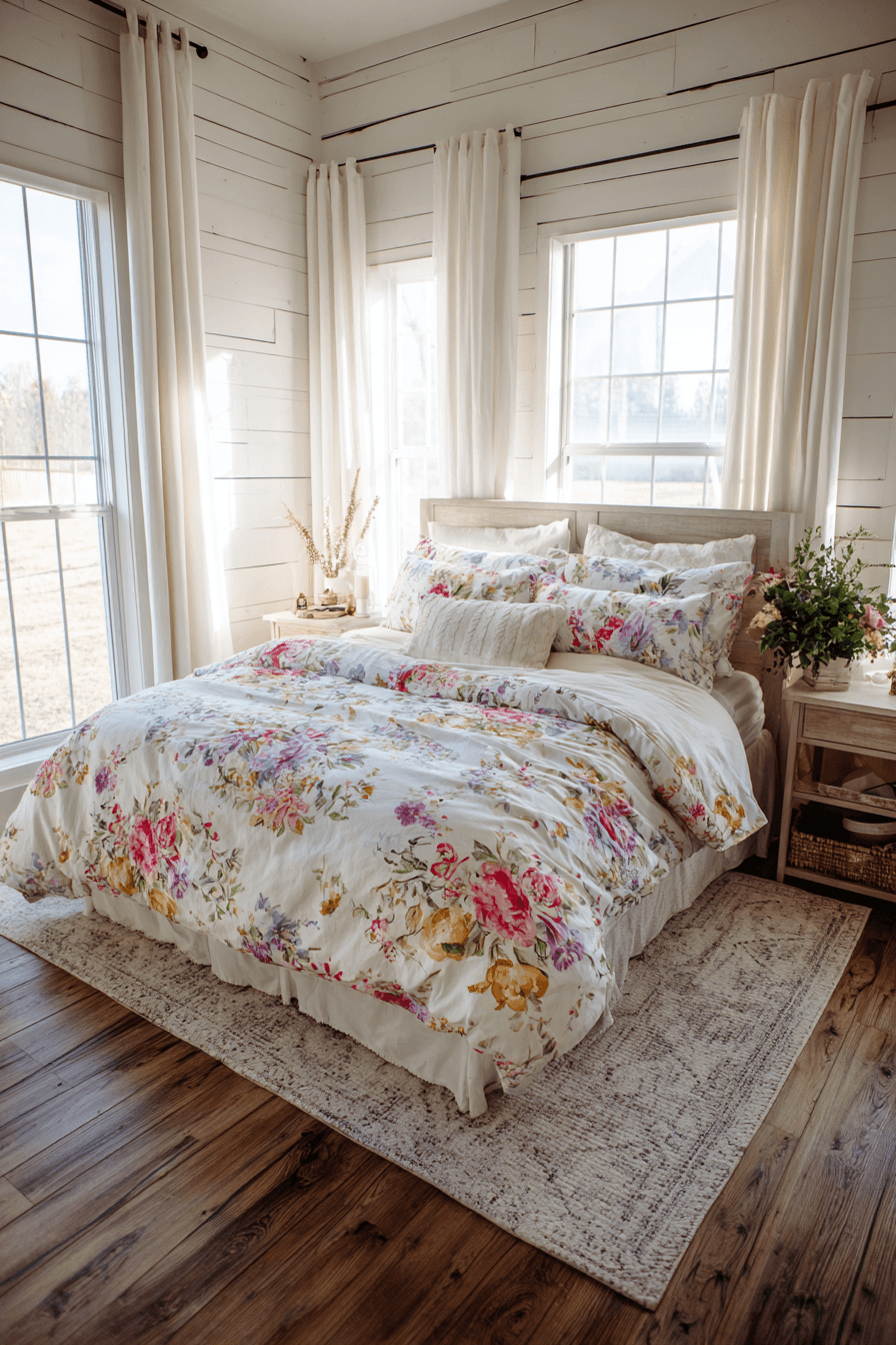 Floral bedding introduces softness into farmhouse spring home decor ideas while refreshing the bedroom for spring. Gentle prints bring nature indoors in a subtle, calming way. Paired with neutral furniture, the look stays balanced and cozy. Light fabrics enhance comfort while keeping things breathable. Even small changes can transform the room. Update your bedroom with farmhouse spring home decor ideas that feel fresh and inviting!