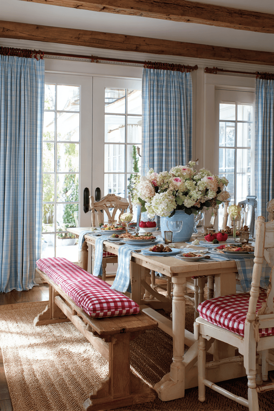 Gingham curtains bring cheerful charm into farmhouse spring home decor ideas with their soft, classic pattern. Light spring colors keep the look bright and inviting. They filter sunlight while adding a cozy, nostalgic feel. The pattern works beautifully in kitchens and dining areas. This simple update refreshes windows instantly. Style your home with farmhouse spring home decor ideas that feel timeless!