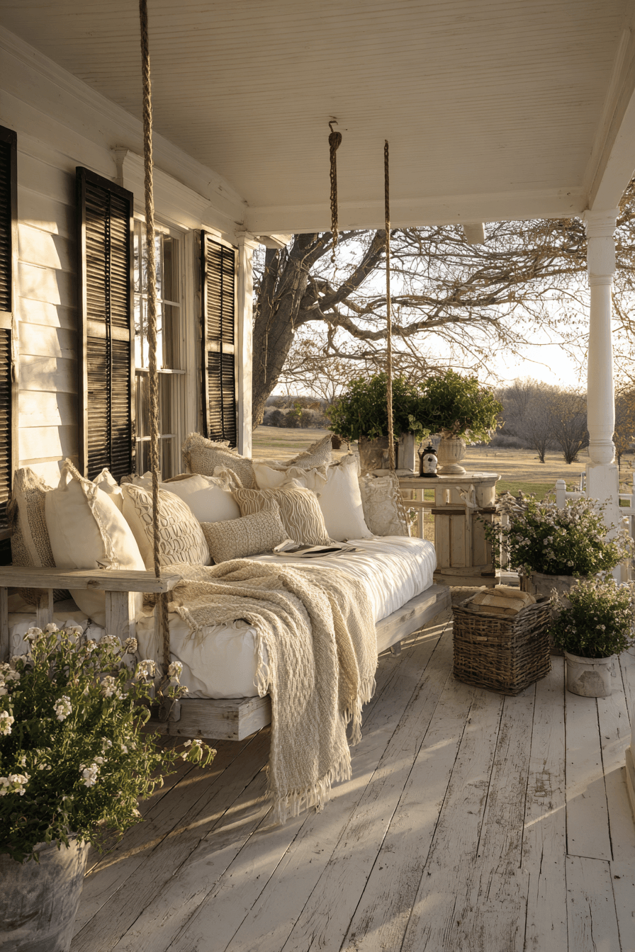 Porch swing daybeds create a relaxing outdoor escape within farmhouse spring home decor ideas. Soft cushions and throws make them feel cozy and inviting. Gentle movement adds a calming effect perfect for spring days. These setups extend your living space outdoors beautifully. The design feels laid-back and welcoming. Turn your porch into a retreat with farmhouse spring home decor ideas like this!