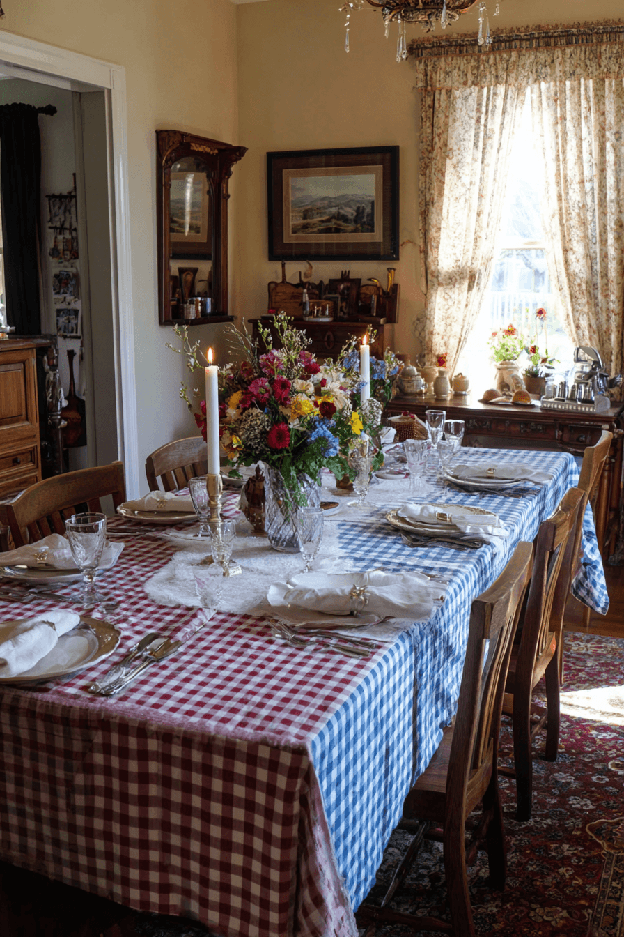 Checkered tablecloths add classic charm to farmhouse spring home decor ideas with their simple, nostalgic pattern. Lighter colors keep the look fresh for spring. These pieces work for both indoor and outdoor dining. The design feels cozy and welcoming for gatherings. They’re both stylish and practical. Style your table with farmhouse spring home decor ideas that feel timeless!