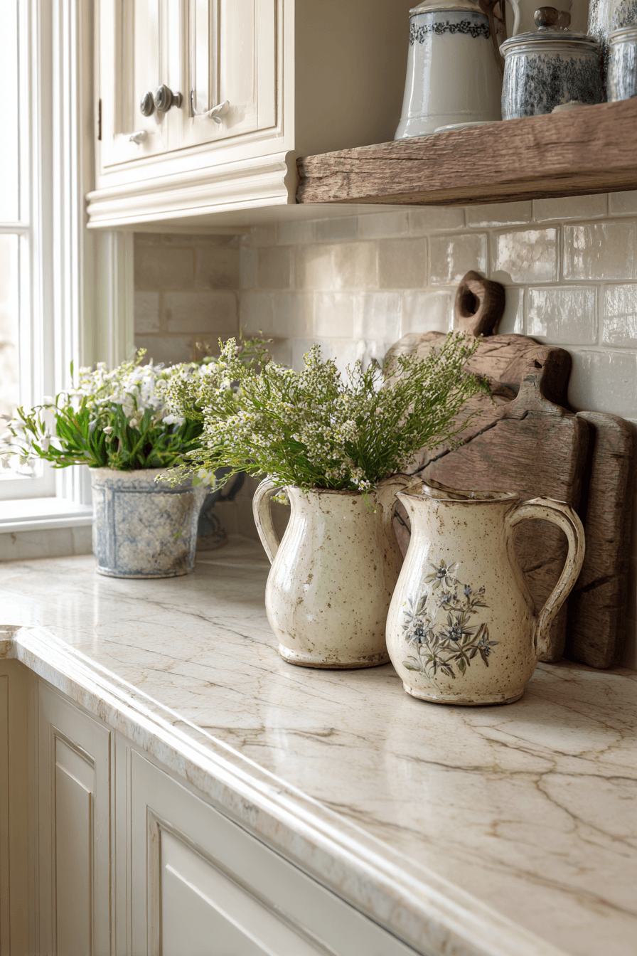 Rustic ceramic pitchers bring warmth into farmhouse spring home decor ideas with their textured, handcrafted look. Used for drinks or flowers, they feel versatile and charming. Their natural finish pairs beautifully with wood and neutral tones. Displaying them adds character to shelves or tables. Small details like this make a big difference. Add charm with farmhouse spring home decor ideas that feel authenti
