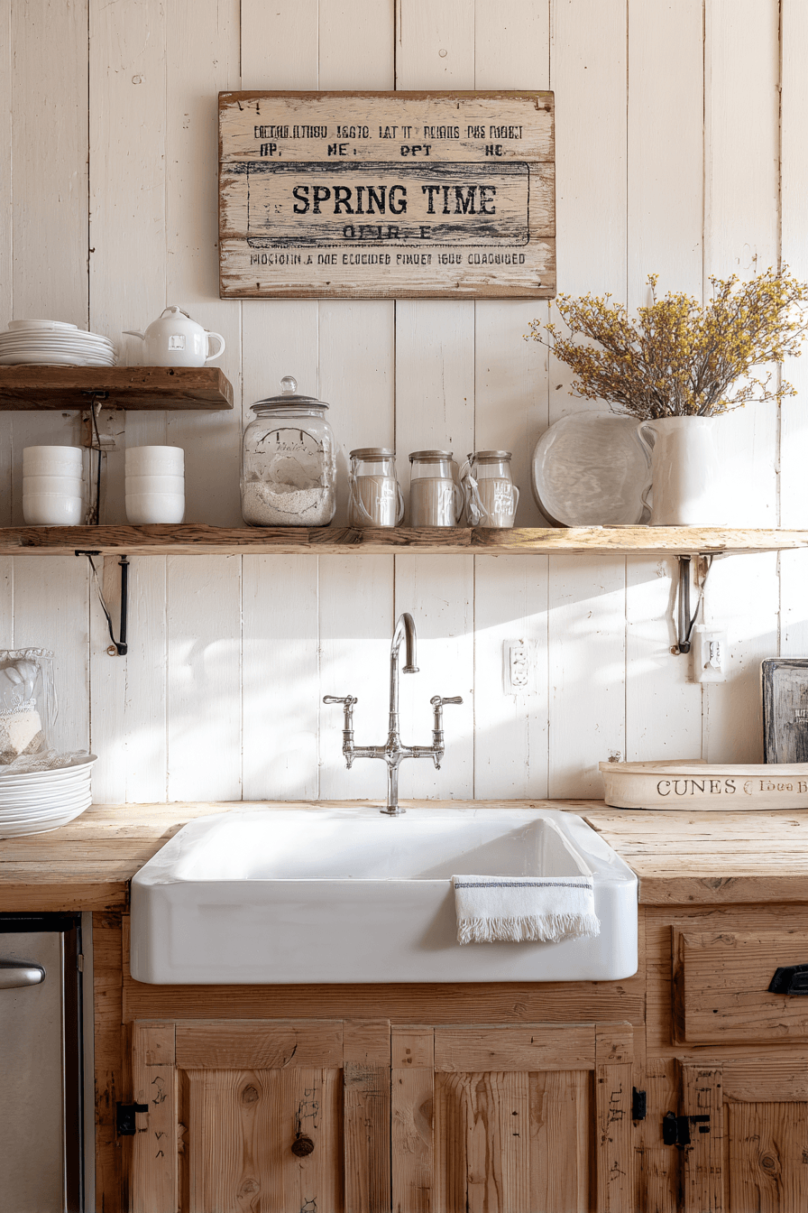 Rustic wood signs add personality to farmhouse spring home decor ideas with simple seasonal phrases that feel cheerful and inviting. Placed on shelves or entry tables, they instantly set the tone for spring. Natural finishes blend seamlessly with neutral palettes and farmhouse textures. These pieces feel personal without overwhelming the space. Switching them out each season keeps things fresh. Get inspired by more farmhouse spring home decor ideas that add charm instantly!