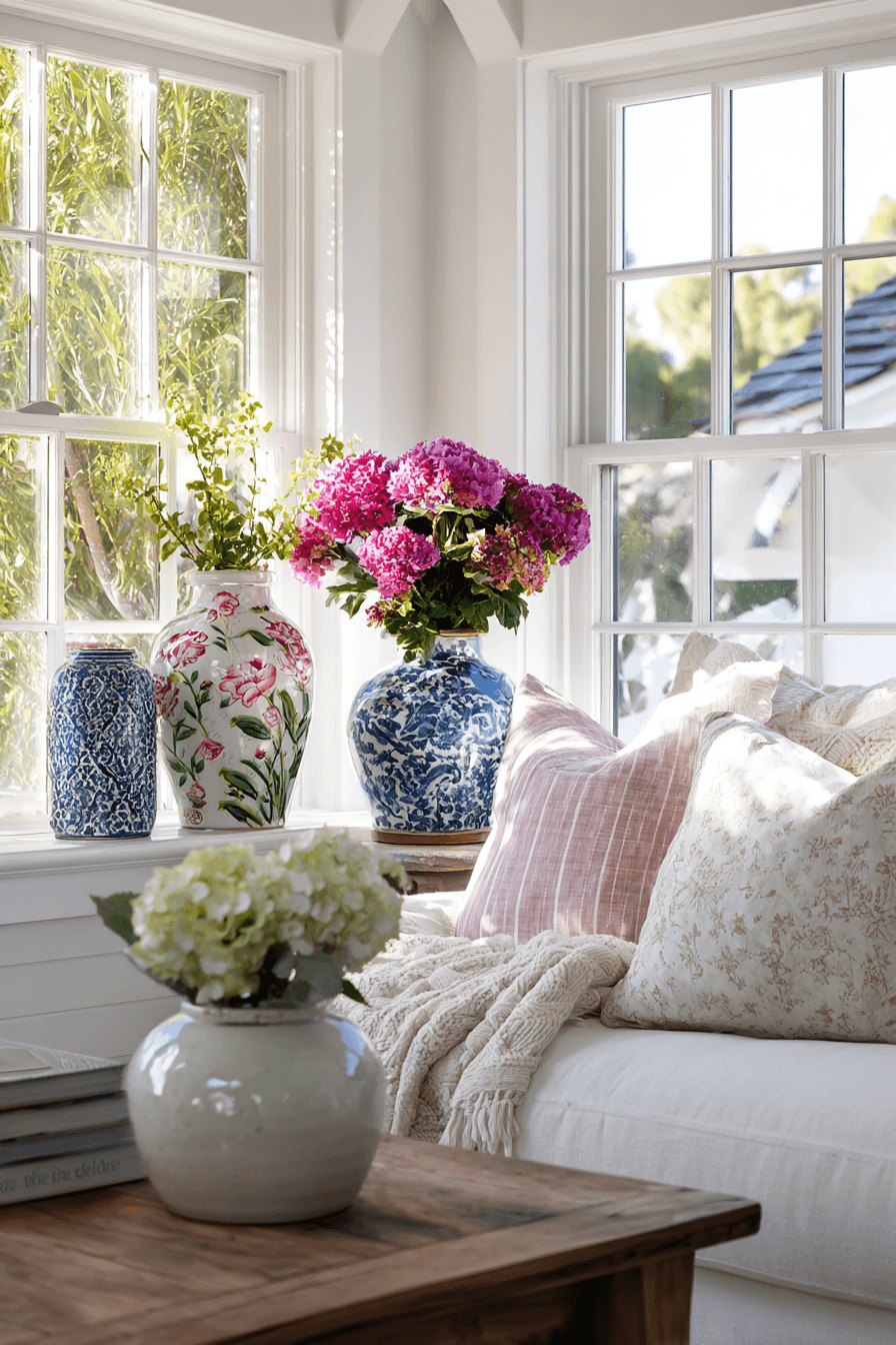 Handcrafted ceramics introduce artistic charm into farmhouse spring home decor ideas through unique textures and subtle patterns. Each piece feels personal and slightly imperfect in the best way. Filled with greenery or blooms, they instantly brighten shelves and tables. Their soft colors blend beautifully with farmhouse palettes. These accents add warmth and authenticity. Add character to your home with farmhouse spring home decor ideas like this!