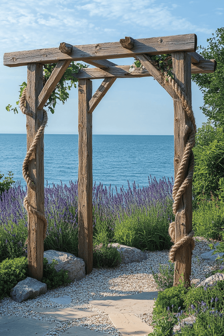 Relaxed and breezy, coastal-inspired garden arbor ideas use rope and weathered wood for a laid-back look. Thick rope details woven through the frame create a nautical feel. Climbing plants soften the structure while adding fresh greenery. The entire design feels casual, airy, and full of character. It’s perfect for bringing seaside vibes into your garden. Get inspired by garden arbor ideas with coastal charm.