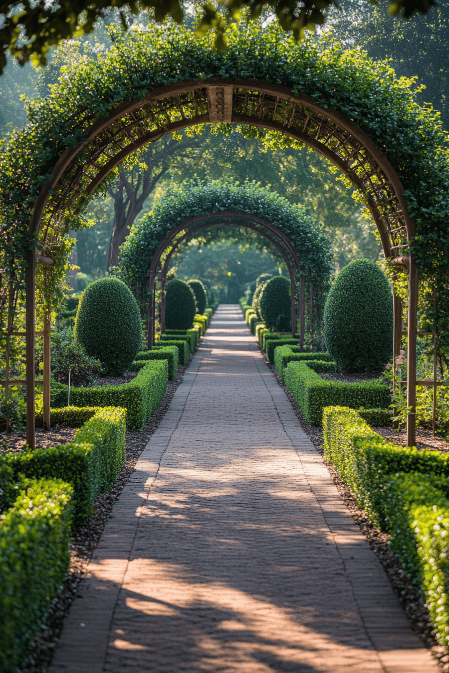Elegant and refined, garden arbor ideas featuring sculpted topiary create a polished garden look. Carefully shaped greenery frames the structure with symmetry and style. Durable materials like iron or stone enhance the formal design. The result feels timeless and sophisticated. It’s ideal for grand entrances or special occasions. Discover garden arbor ideas that elevate classic design.