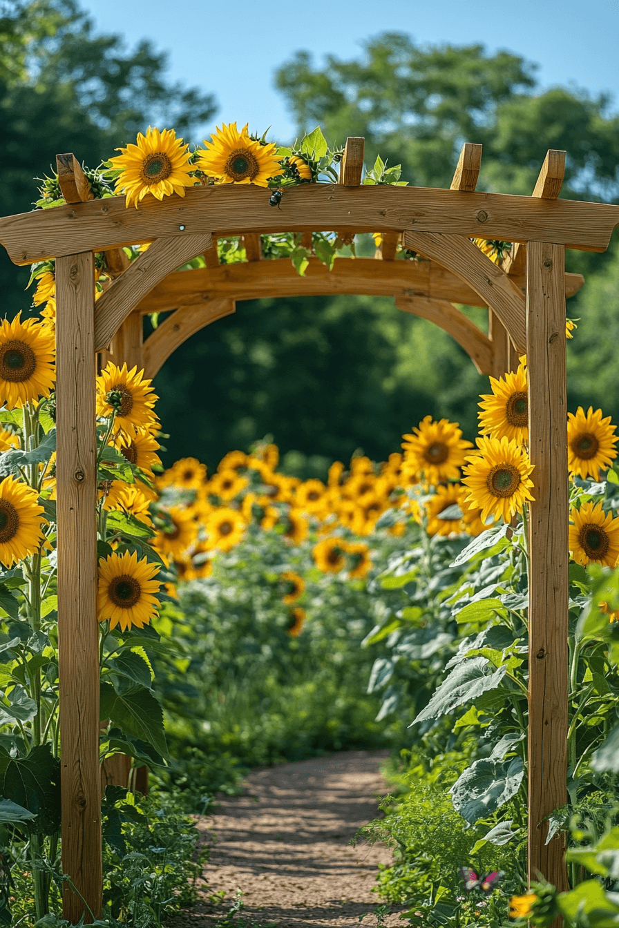 Bright and cheerful, garden arbor ideas with sunflowers bring instant energy to your outdoor space. Tall blooms surrounding the structure create a welcoming and vibrant entry. Their bold yellow tones add warmth and happiness to sunny areas. This style works perfectly as a seasonal feature or photo backdrop. The mood feels lively and uplifting. Explore garden arbor ideas full of color and joy.