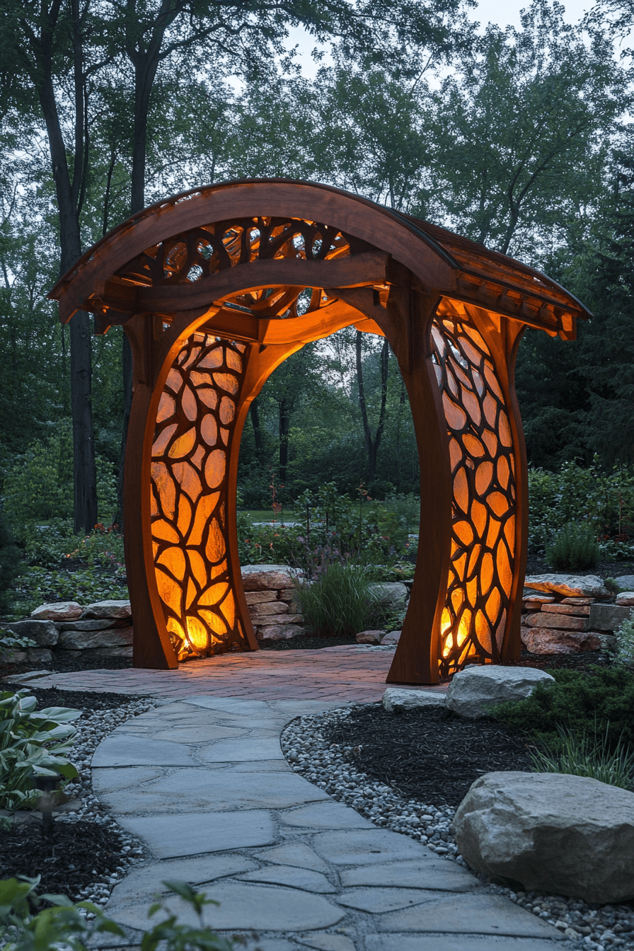 Creative expression shines through garden arbor ideas that incorporate sculptural elements. Carved wood or shaped metal transforms the arbor into an artistic centerpiece. The design adds personality and a modern edge to your space. It becomes more than just a plant support—it’s a statement piece. The result feels bold and unique. Explore garden arbor ideas that double as art.