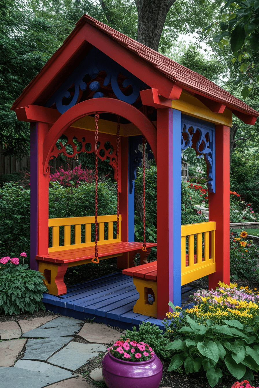 Playful and imaginative, garden arbor ideas for children’s spaces bring fun into your yard. Bright colors and creative shapes make the structure interactive and exciting. Surrounding flowers add movement and life to the space. It’s perfect for family-friendly gardens. The atmosphere feels lively and joyful. Explore garden arbor ideas designed for playful moments.