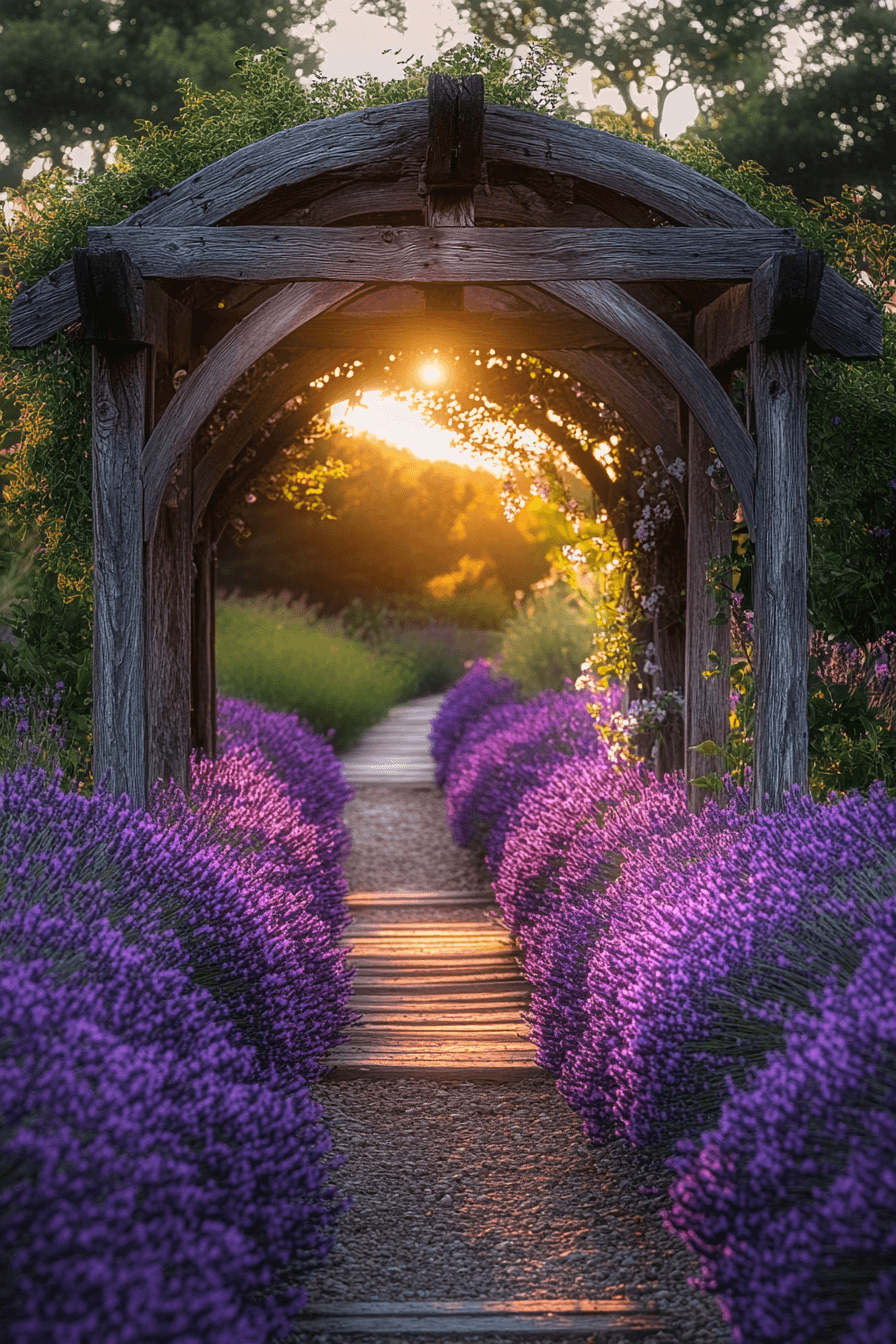 Soft fragrance and calming tones define garden arbor ideas centered around lavender. A simple frame allows the plants to flourish beautifully. The purple blooms add a soothing pop of color. Placing it near seating areas enhances relaxation. The space feels peaceful and elegant. Explore garden arbor ideas that bring gentle serenity.