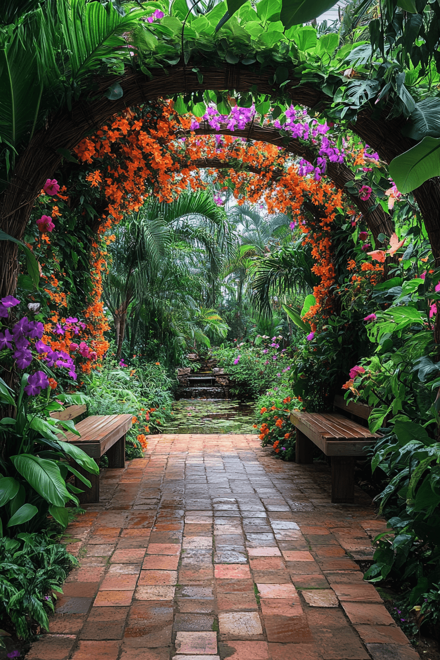 Transform your yard into an oasis with garden arbor ideas featuring tropical climbing plants. Lush vines create dense coverage that adds shade and texture. A strong structure supports vibrant growth. The atmosphere feels warm and inviting. It’s like a vacation at home. Discover garden arbor ideas with tropical energy.
