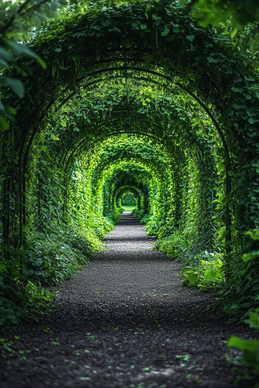 A dramatic green tunnel comes to life with garden arbor ideas featuring dense climbers. Plants like ivy form a natural canopy overhead. The shaded path feels cool and immersive. It creates a secret garden atmosphere. Walking through feels like an escape. Explore garden arbor ideas that transform pathways.