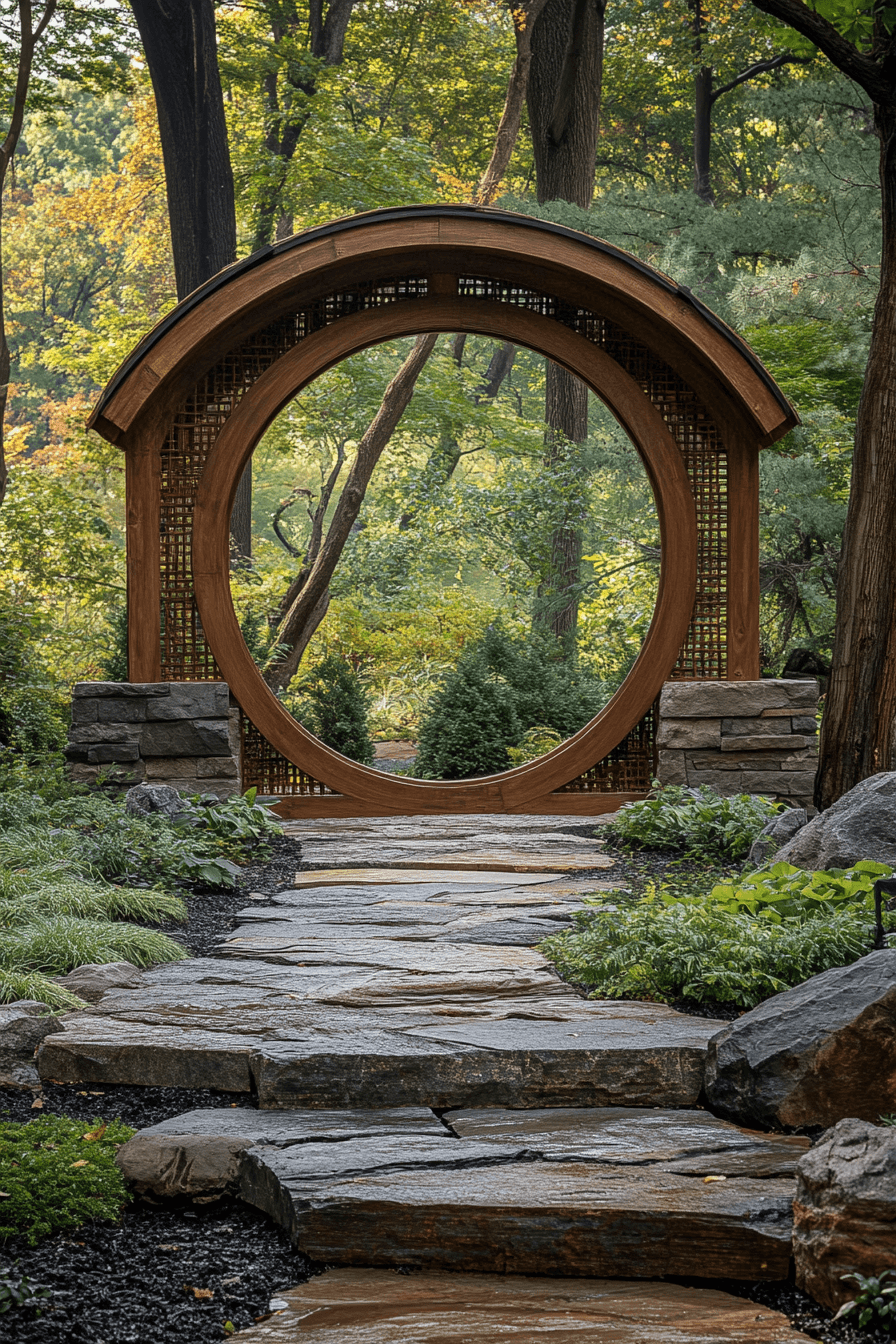 A circular moon gate design brings elegance to garden arbor ideas with architectural flair. The shape invites movement and curiosity. Climbing flowers frame the structure beautifully. It acts as both entrance and feature. The look feels timeless and symbolic. Explore garden arbor ideas with unique structure.