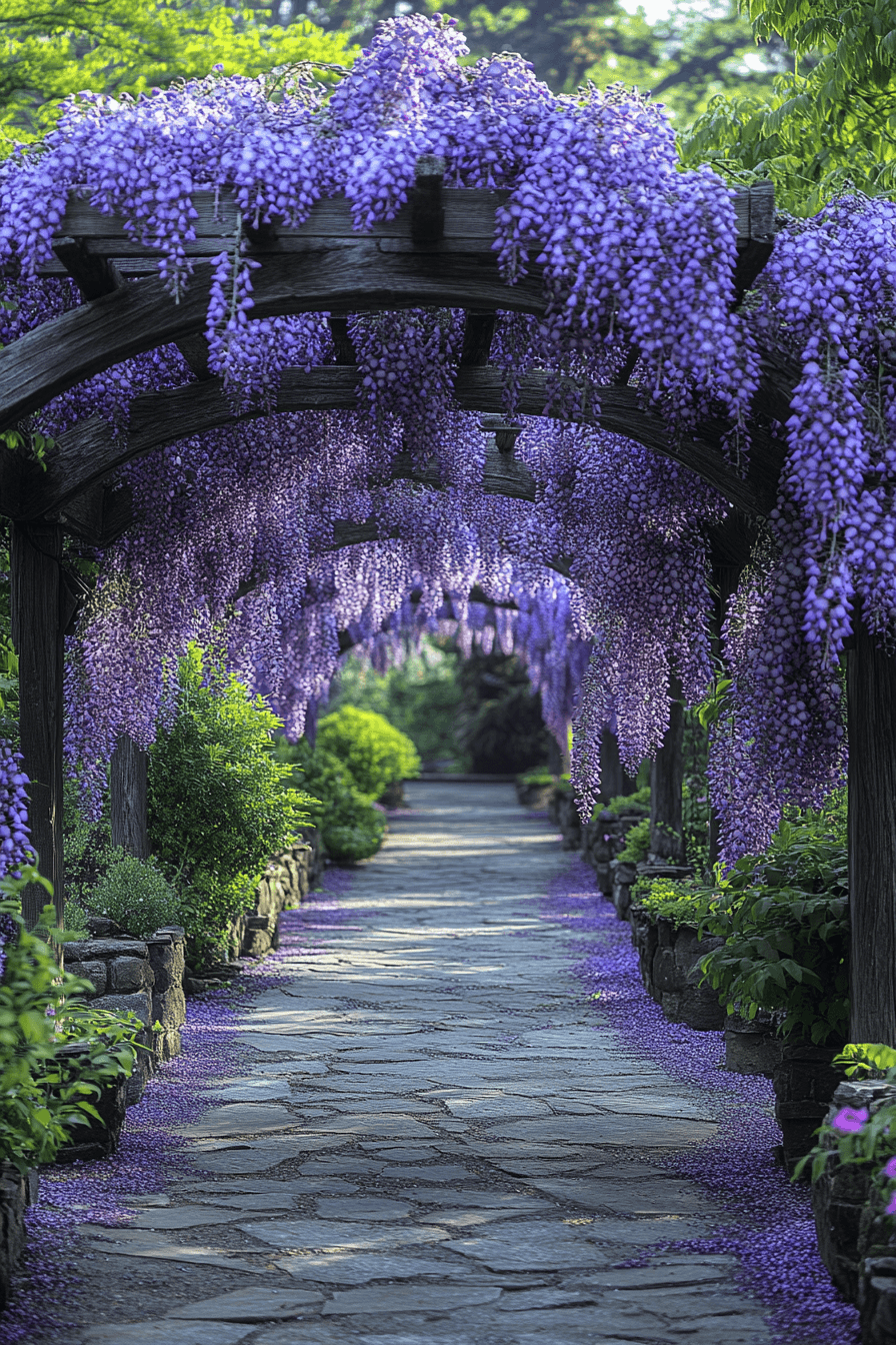 Few garden arbor ideas feel as magical as one draped in flowing wisteria blooms. The cascading flowers add color, elegance, and a gentle fragrance that transforms your outdoor space. A strong wooden or iron frame supports the lush vines as they grow into a breathtaking feature. When in full bloom, the arbor becomes an unforgettable focal point. It’s perfect for shaded paths or dreamy seating areas. Find inspiration with garden arbor ideas that highlight floral beauty.
