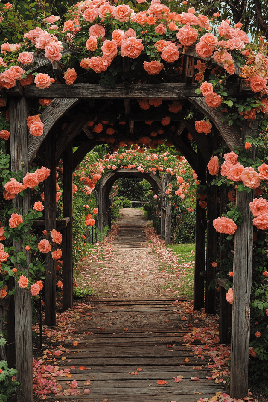 Romantic and timeless, rose-covered designs are among the most loved garden arbor ideas for classic landscapes. Painted wood or elegant metal frames create the perfect support for climbing blooms. When roses are in full bloom, the arbor becomes a fragrant and colorful showpiece. It works beautifully for entrances, pathways, or special gatherings. The overall vibe is soft, elegant, and dreamy. Step into more garden arbor ideas filled with romantic charm.