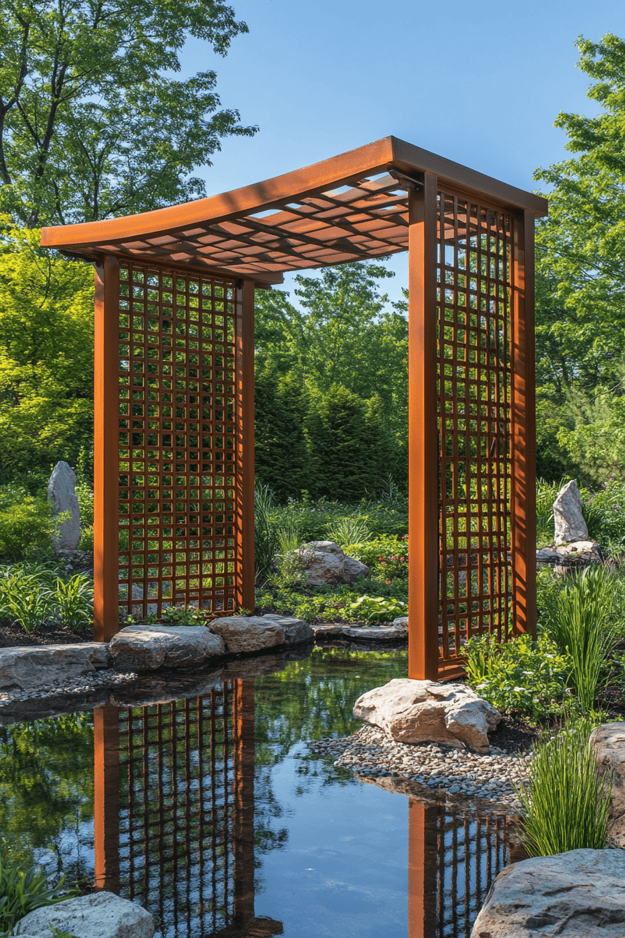 A modern steel trellis offers a stylish twist on traditional garden arbor ideas while delivering long-lasting durability. Sleek lines and polished finishes pair beautifully with climbers like jasmine or clematis. The reflective surface can brighten shaded corners and add subtle visual interest. It’s a low-maintenance option that still feels bold and impactful. The look is both practical and eye-catching. Discover garden arbor ideas that highlight modern materials.