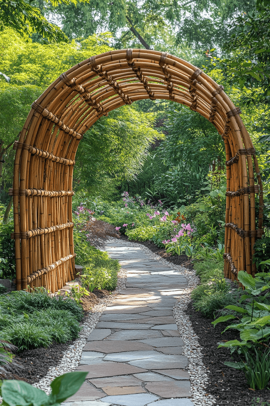 Eco-friendly style shines with garden arbor ideas crafted from natural bamboo. Its strength and flexibility allow for creative arch designs that feel both modern and organic. The natural texture blends effortlessly into greenery while supporting climbing plants. This design introduces a subtle tropical feel without overwhelming the space. It’s a smart and sustainable choice. Discover garden arbor ideas that celebrate natural materials.