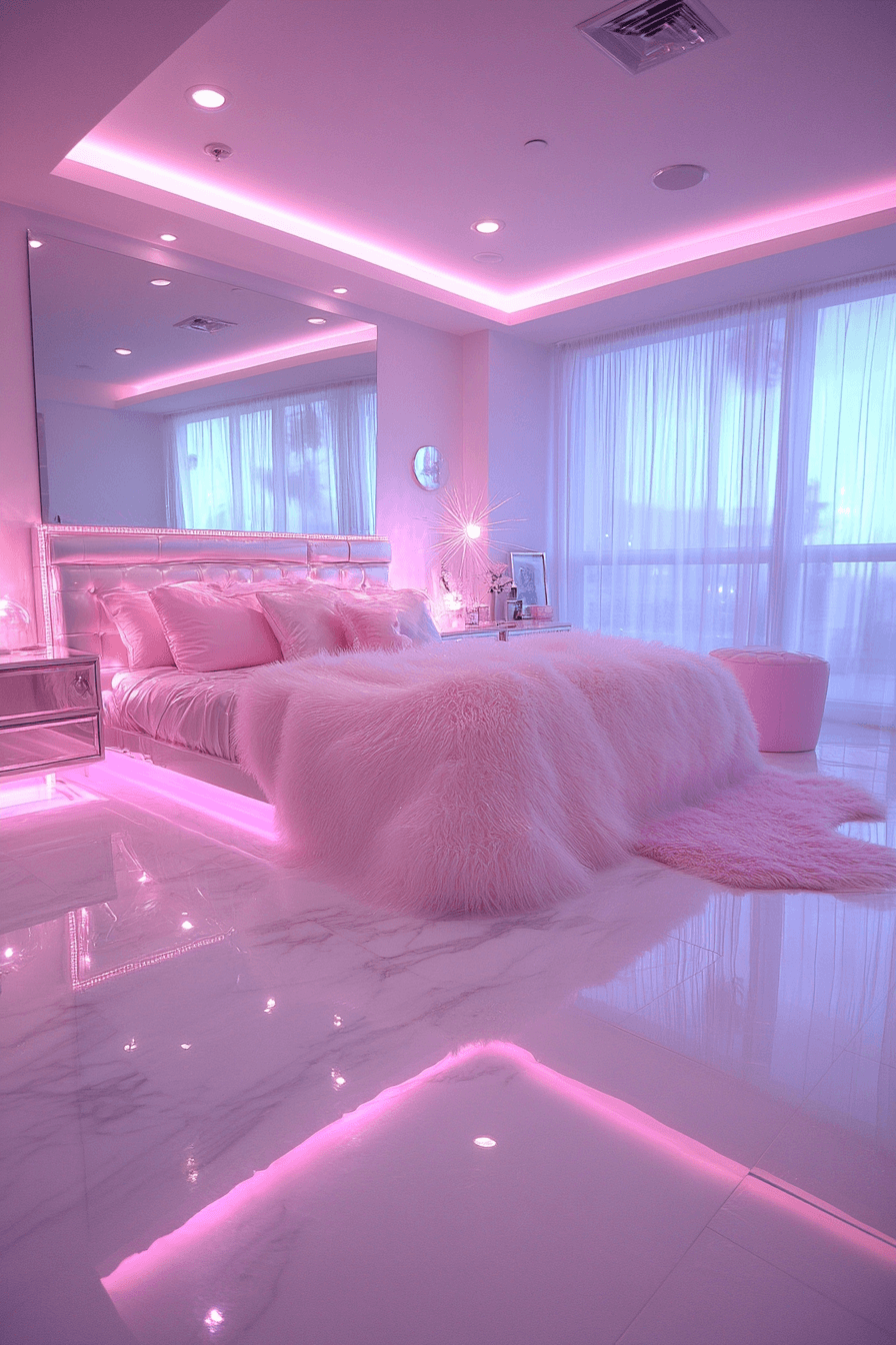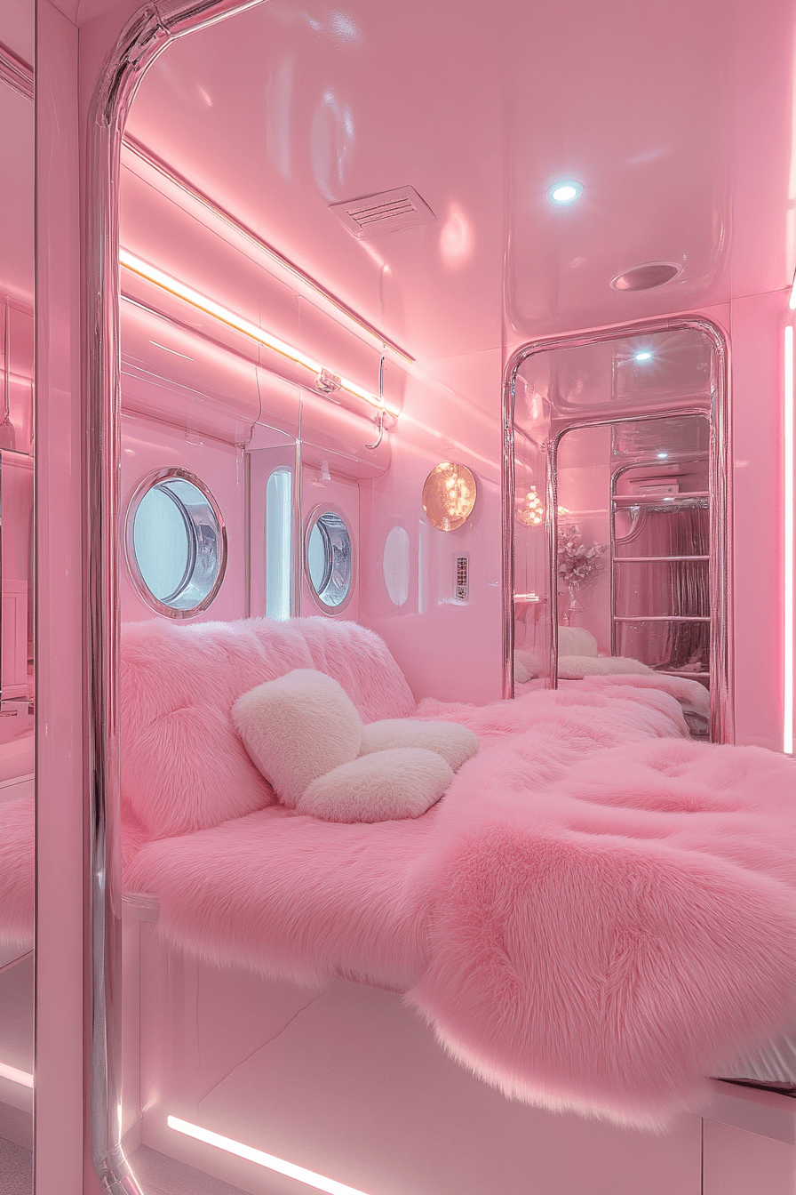 A striking blend of vibrant pink hues and polished metallic finishes can completely transform girlie room decor into a bold, modern statement. Sleek chrome mirrors, glossy furniture, and eye-catching lighting create a high-impact look that feels fresh and stylish. Keeping the layout clean allows the shine and color to take center stage without overwhelming the space. The contrast between softness and reflective surfaces adds a futuristic, fashion-forward vibe. It’s ideal for anyone craving a glamorous upgrade with personality. Discover more girlie room decor ideas that sparkle with modern edge.