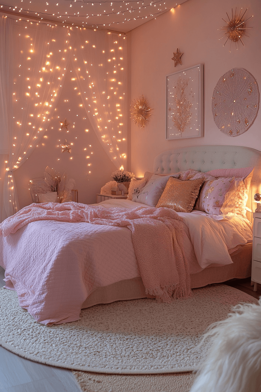 Celestial-inspired elements can transform girlie room decor into a magical, glowing retreat. Starry lighting, fairy lights, and soft blush tones create a dreamy atmosphere that feels out of this world. Pairing these features with cozy fabrics and warm metallic accents enhances the inviting feel. The room becomes both relaxing and visually captivating. It’s like having a personal escape right at home. Explore more girlie room decor ideas inspired by the stars.