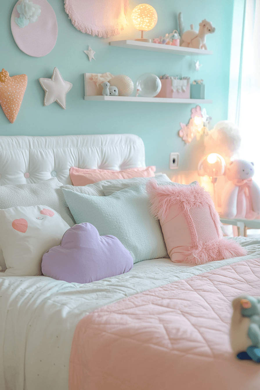 Playful pastel combinations bring energy and joy into girlie room decor with a fresh, colorful twist. Soft pinks, baby blues, mint greens, and lilacs create a harmonious yet lively palette. Color-blocked walls or decor pieces add a modern edge while keeping the space light. Clean lines help maintain balance and prevent clutter. The overall feel is cheerful and expressive. Discover more girlie room decor ideas bursting with pastel charm.