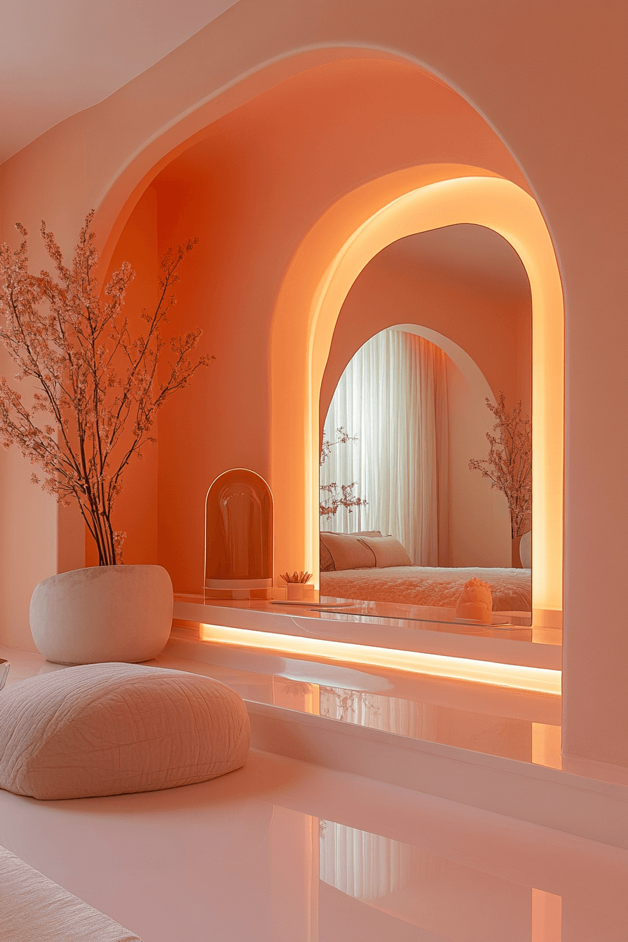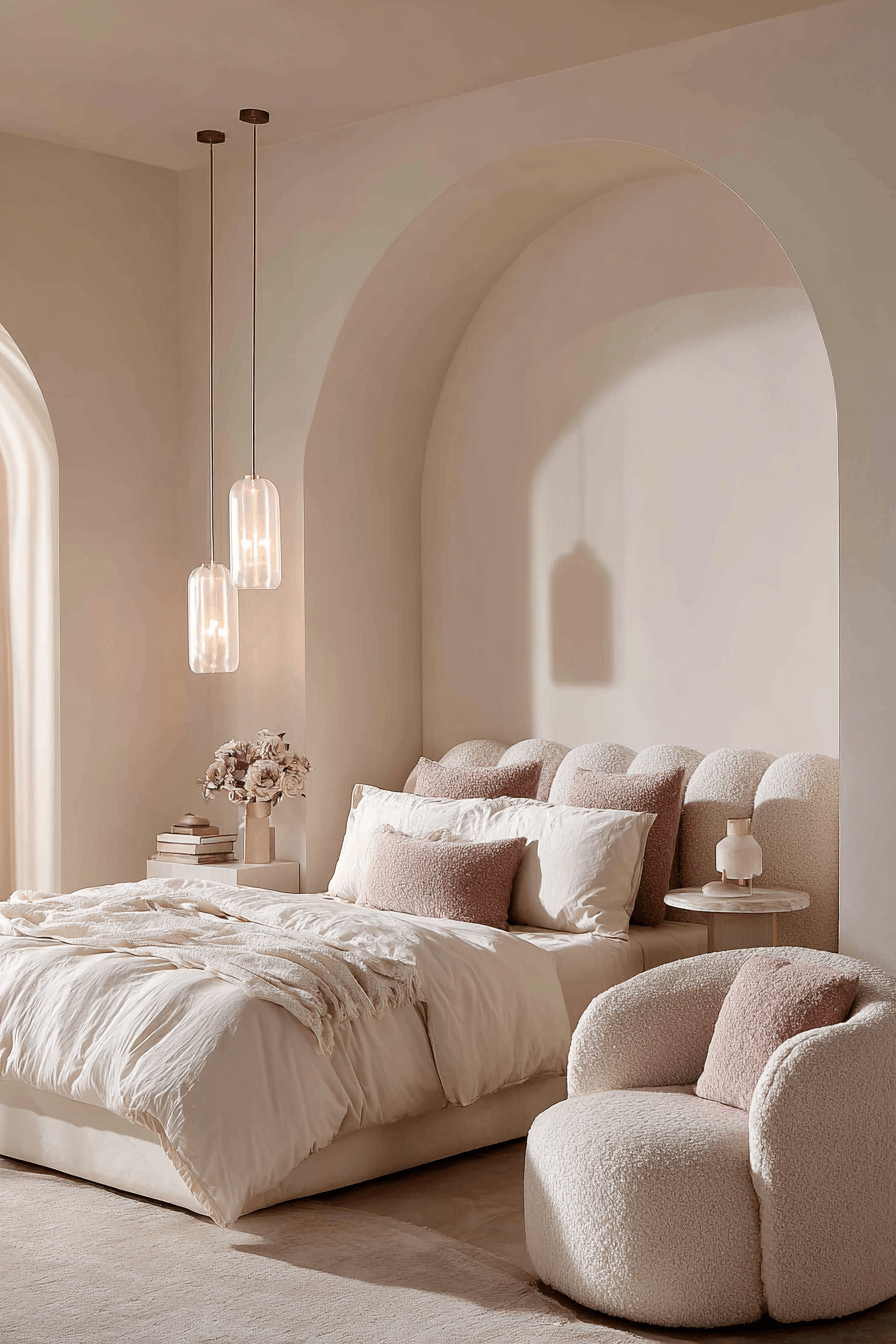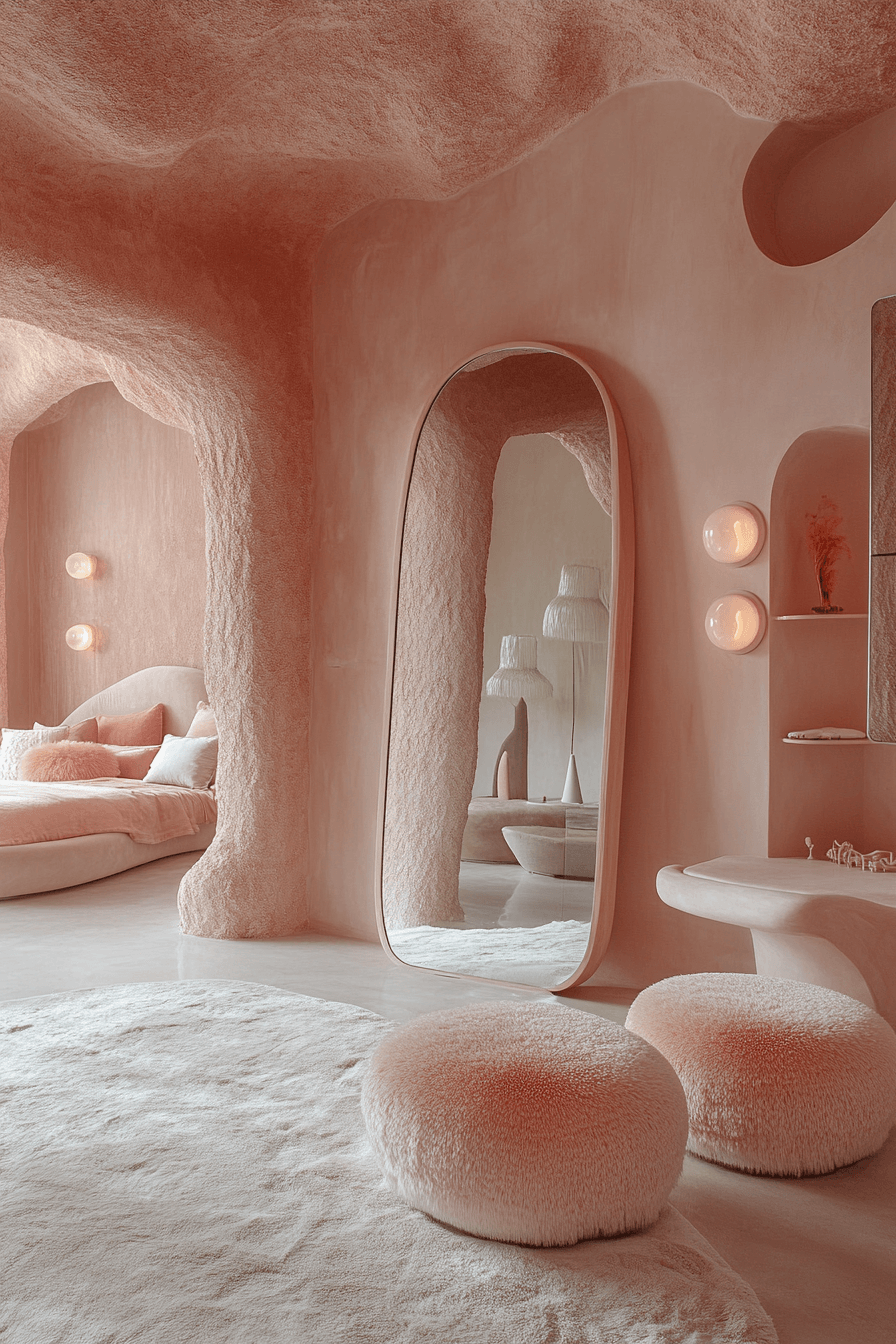 Curved details bring a trendy, editorial feel to girlie room decor while maintaining warmth. Wavy mirrors, rounded furniture, and soft shapes create a smooth visual flow. Neutral tones with hints of blush keep the palette cohesive. Textures like boucle and velvet add depth and comfort. The overall look feels modern and feminine. Discover more girlie room decor ideas with stylish curves.