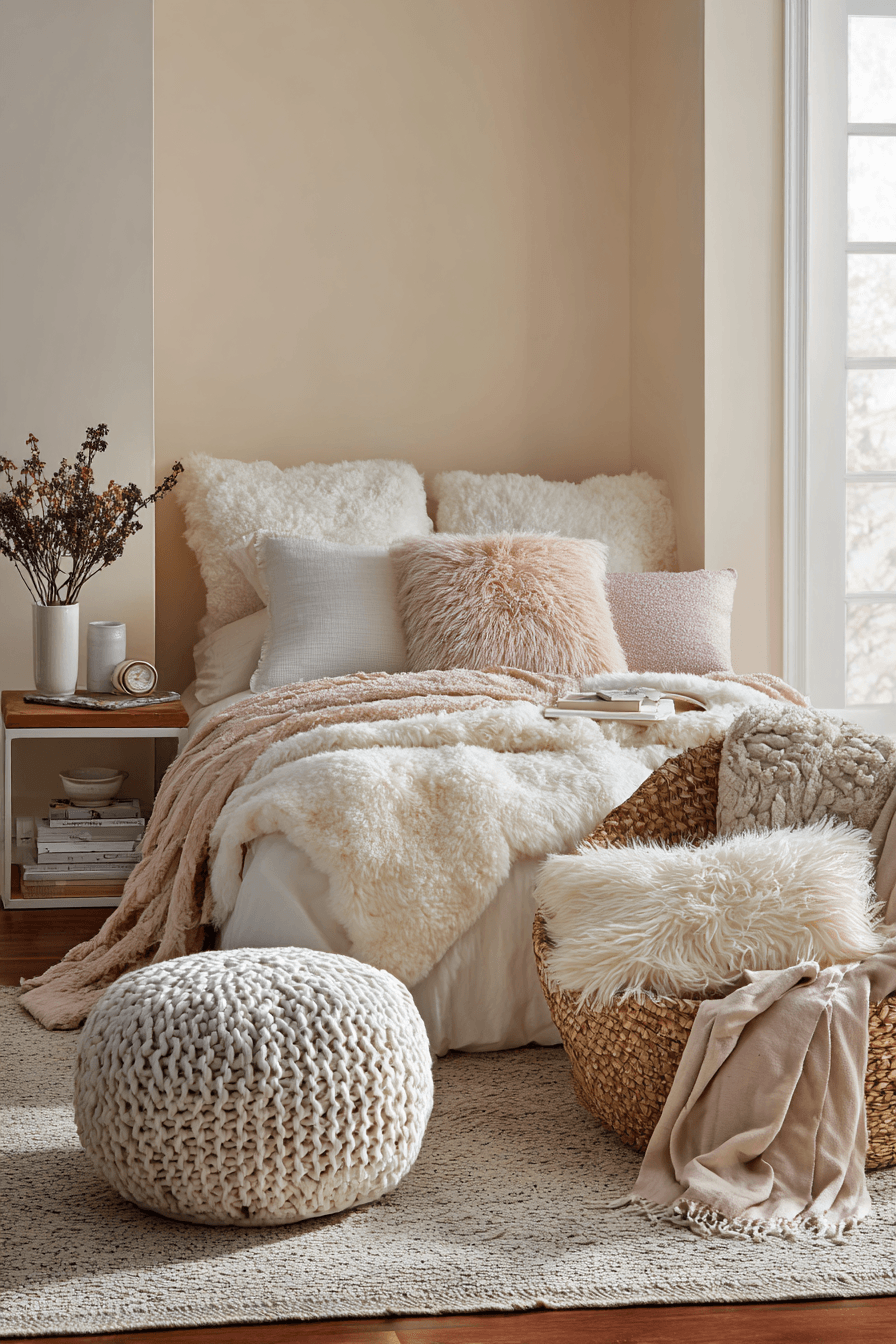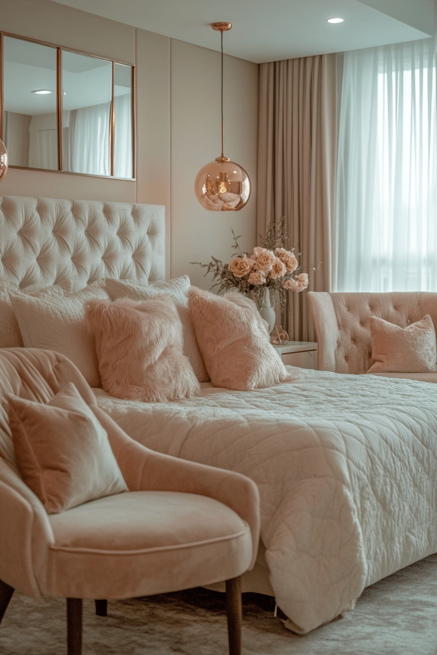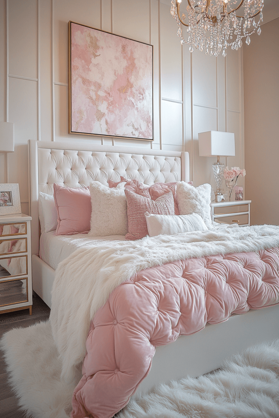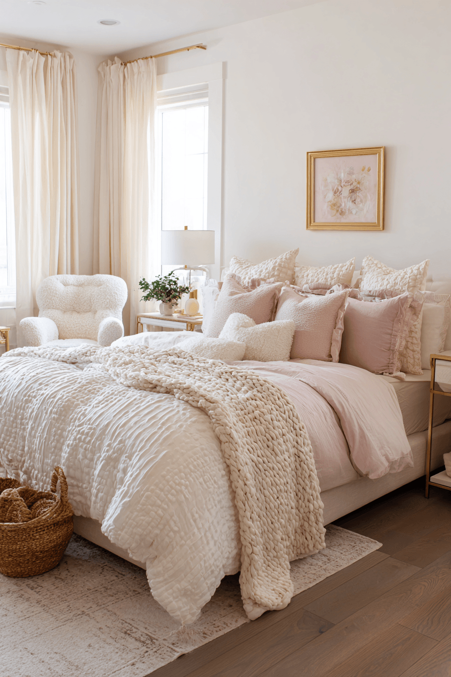 Blending creamy neutrals with blush accents creates a timeless and cozy look in girlie room decor. Soft tones keep the space light while pink details add warmth and femininity. Textured elements like faux fur and boucle enhance comfort. Gold lighting introduces a subtle touch of sophistication. The overall balance feels effortless and refined. Discover more girlie room decor ideas with cozy neutral charm.