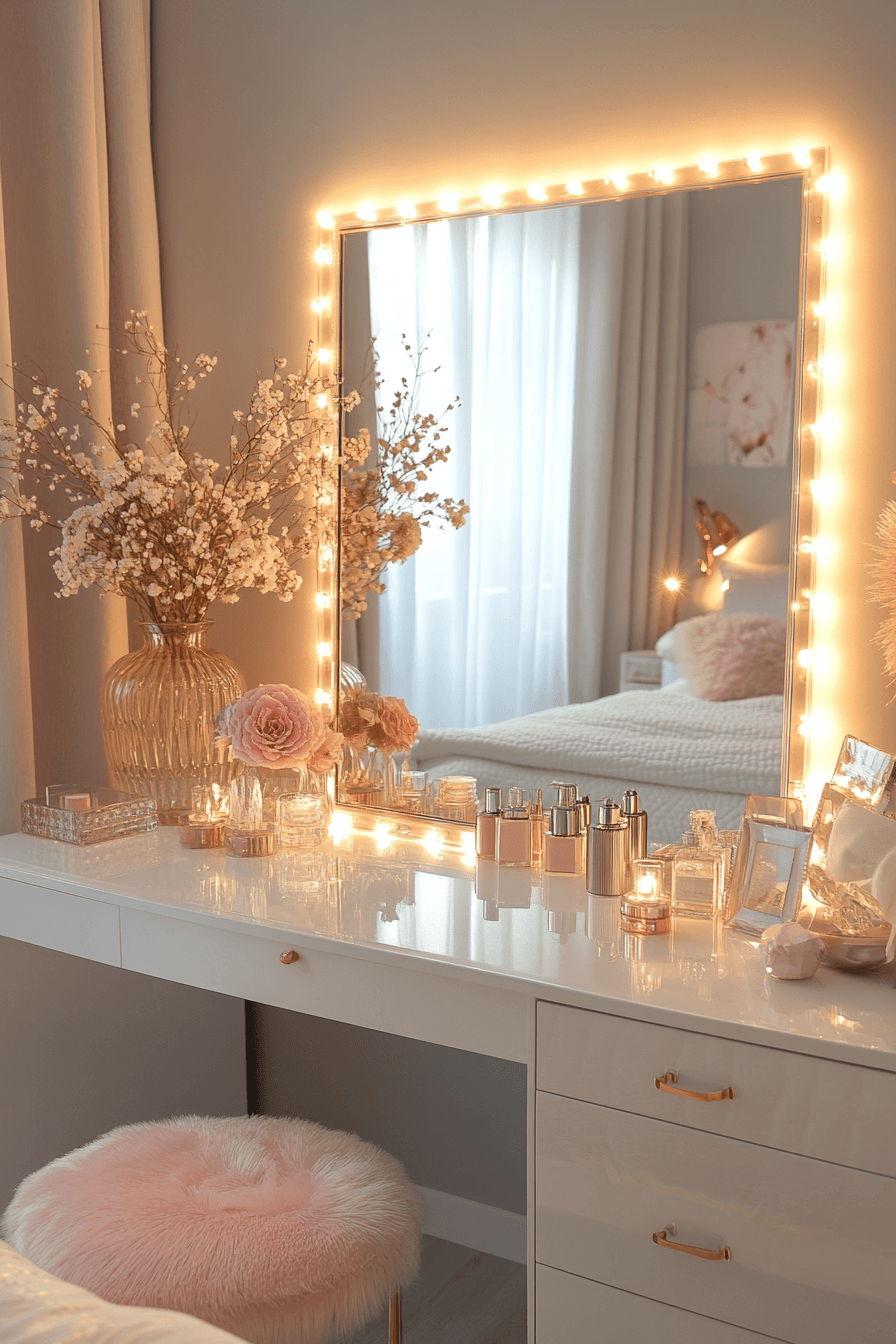 Lighting becomes the star of girlie room decor when layered thoughtfully throughout the space. Backlit mirrors, LED strips, and glowing accents create a radiant atmosphere that feels both modern and inviting. Pairing these lighting features with pale pinks or crisp neutrals keeps the look fresh and balanced. A sleek vanity with illuminated edges adds both beauty and functionality. The room feels bright, reflective, and full of personality. Discover more girlie room decor ideas that shine with style.