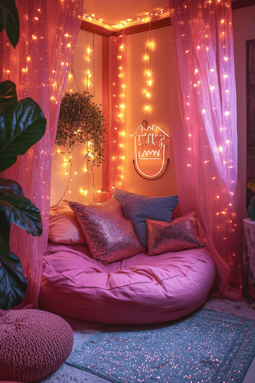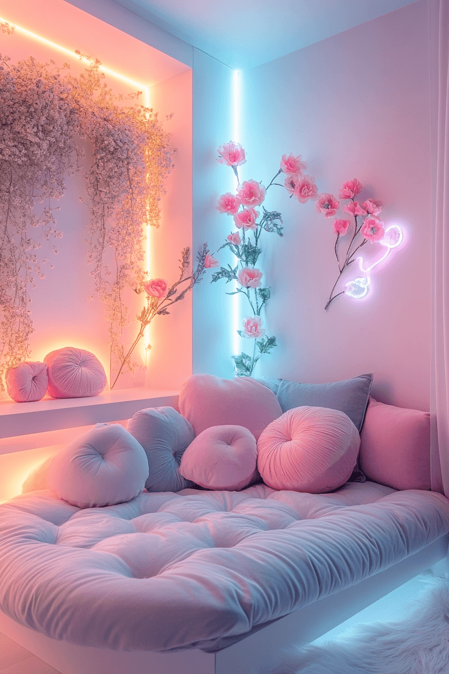 Playful lighting effects can transform girlie room decor into a colorful, personality-filled space. Soft LED hues in pink and blue create a dreamy ombré effect across the room. Fun decor like heart-shaped lamps or whimsical accessories enhances the playful vibe. Floating shelves styled with pastel accents complete the look. The atmosphere feels cheerful and inviting. Explore more girlie room decor ideas full of charm.