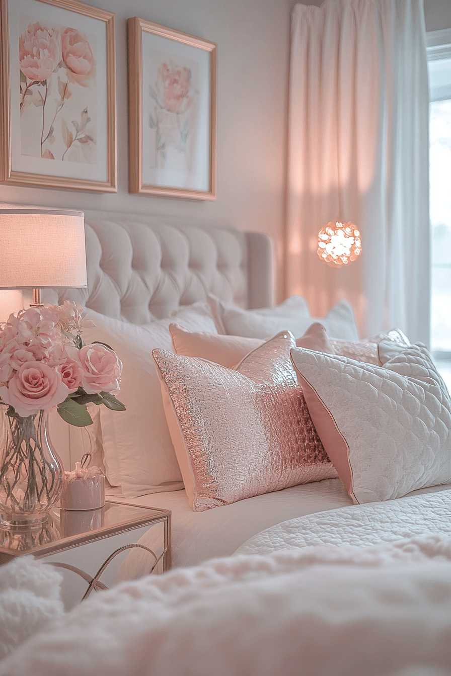 Soft blush tones paired with elegant finishes can turn girlie room decor into a serene yet glamorous escape. Satin bedding, velvet accents, and subtle rose gold lighting bring warmth and gentle sparkle to the space. Symmetry in layout helps maintain a polished and cohesive look. Small details like crystal lamps or mirrored pieces elevate the design without overpowering it. The overall feel is calm, cozy, and refined. Find more girlie room decor ideas that combine softness with elegance.