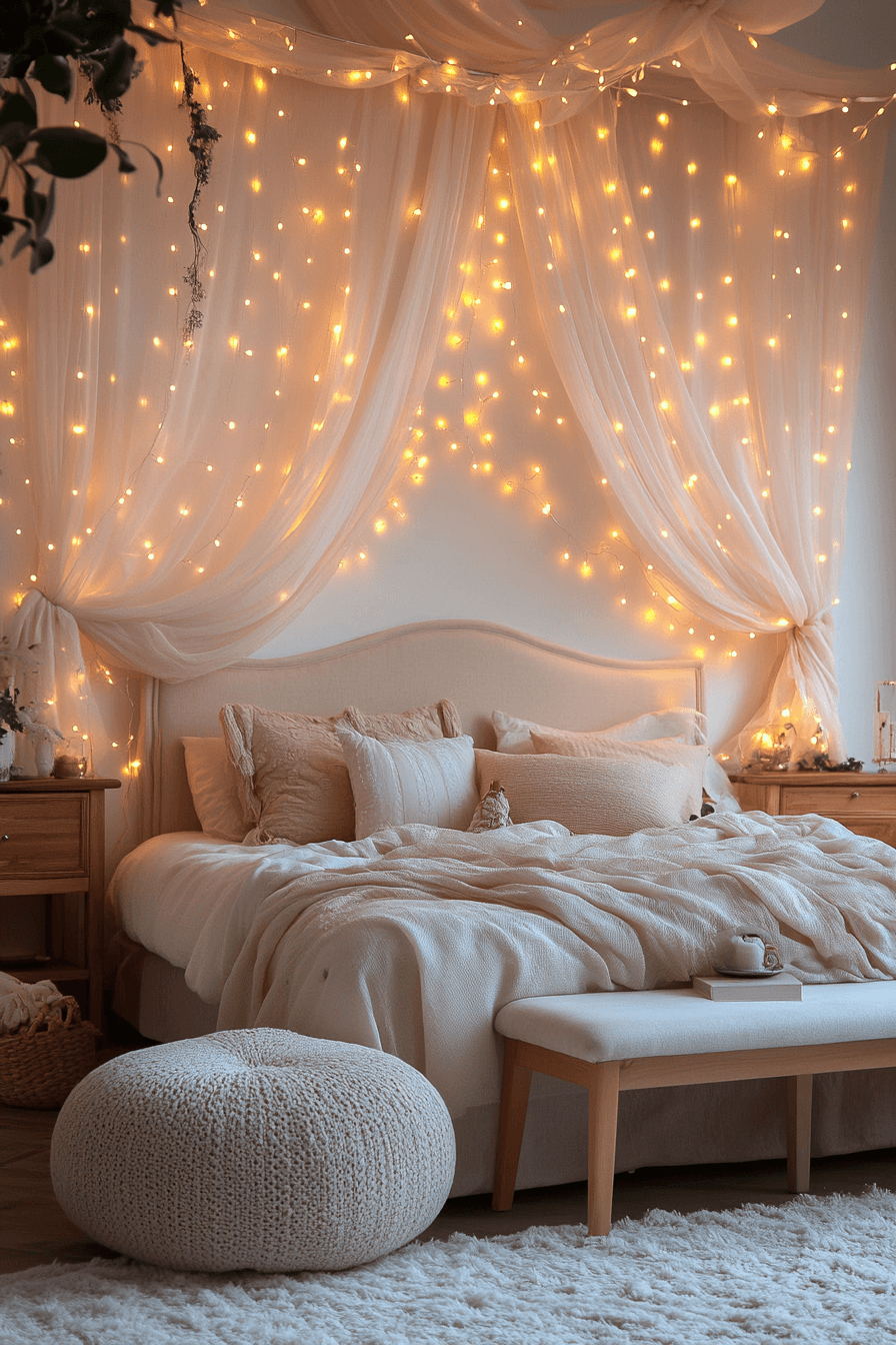 A canopy bed setup can turn girlie room decor into a soft, fairytale-inspired escape. Sheer drapes in blush or white create a gentle frame that adds instant romance. Twinkling lights woven through the fabric provide a warm glow at night. Layered bedding enhances both comfort and visual appeal. The entire space feels dreamy and inviting. Explore more girlie room decor ideas with whimsical elegance.