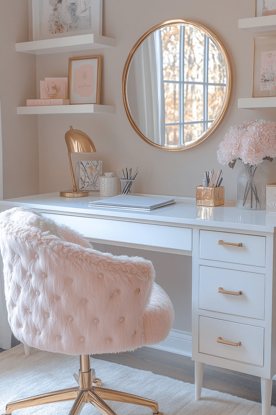 A stylish desk area can enhance girlie room decor by combining beauty with function. A clean desk in soft tones paired with gold accents creates a polished workspace. Acrylic organizers and lighted mirrors keep everything neat while adding a hint of glam. Comfortable seating completes the look without sacrificing style. The space feels inspiring and organized. Discover more girlie room decor ideas for chic productivity.