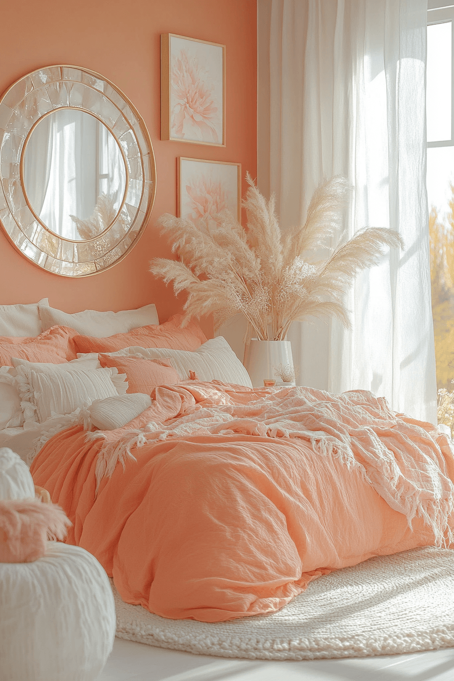 A warm peach color palette can brighten girlie room decor with a cheerful, uplifting vibe. Soft peach bedding paired with neutral walls creates a sunny atmosphere. Coral accents and subtle metallic touches add depth without overpowering the space. Fun decorative elements introduce personality and charm. The room feels lively and inviting. Discover more girlie room decor ideas with warm color energy.